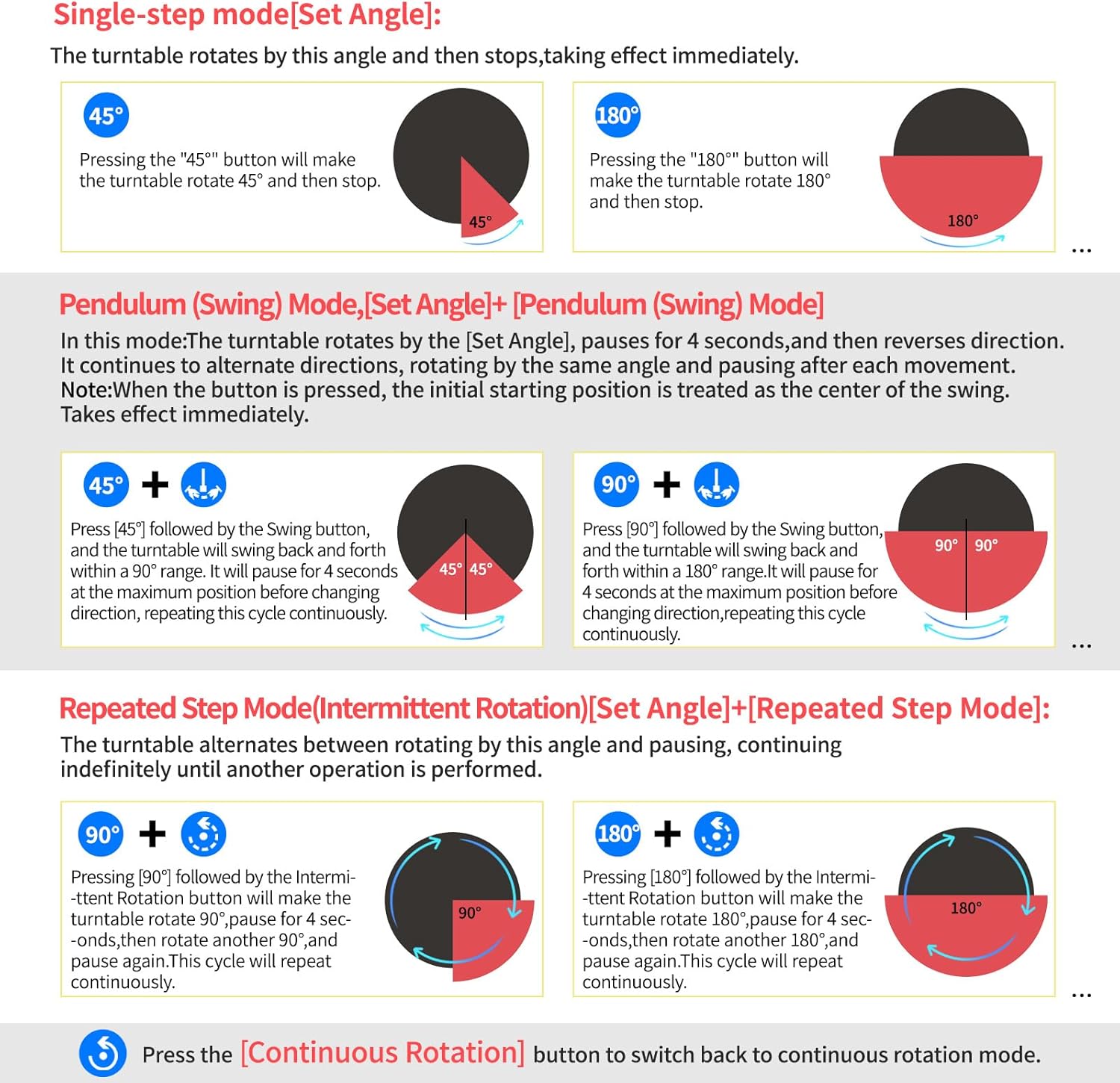 - 【Electric turntable supports remote control of four rotation modes】: Continuous rotation. Single-step rotation at 45°, 90°, and 180°. Repeated step rotation at 45°, 90°, and 180°. Pendulum (swing) rotation at 45°, 90°, and 180°. Allows remote control for both clockwise and counterclockwise rotation. Motorized rotating display stand supports remote control for start/pause and speed adjustment (increase/decrease).