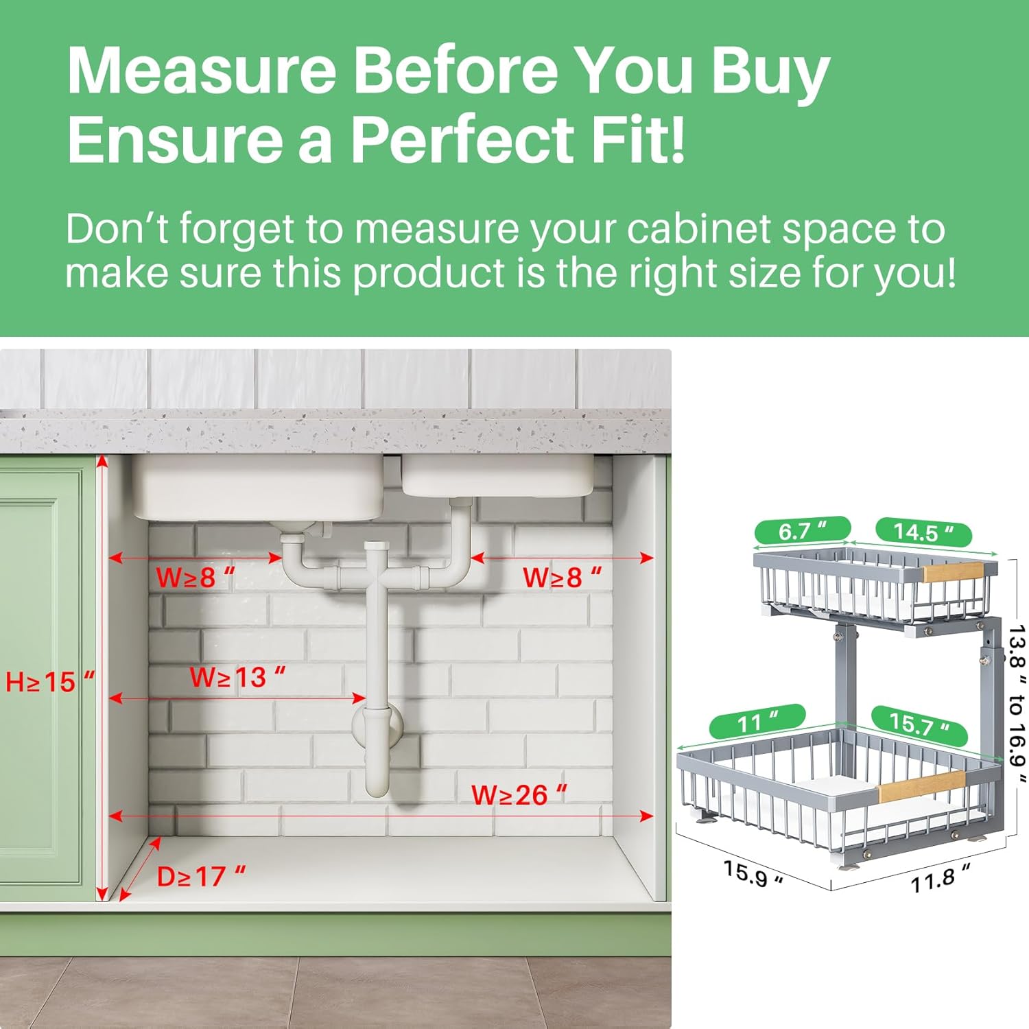 - Larger Organizer for Maximum Efficiency: This under sink organizer, measuring 11.8"W x 15.9"D x (13.8"-16.9")H, providing more capacity for storing taller bottles, cleaning supplies and other essentials.Before purchasing, please double-check your cabinet dimensions to ensure this under cabinet organizer fits properly.