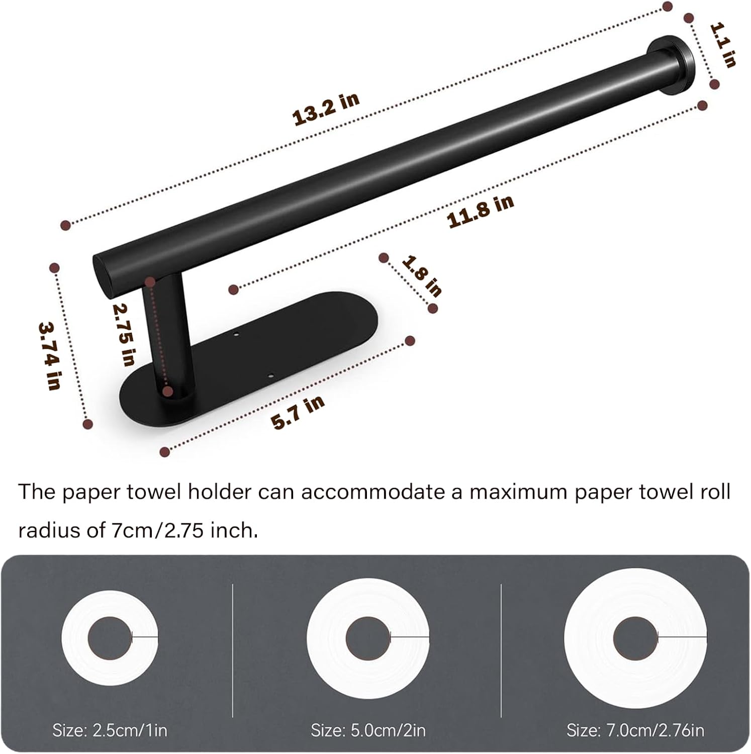 - SIZE : Paper towel holder is 13.2 inches long and 3.74 inches wide.Fits paper towels up to 11.8 inches in length and 2.75 inches in width.