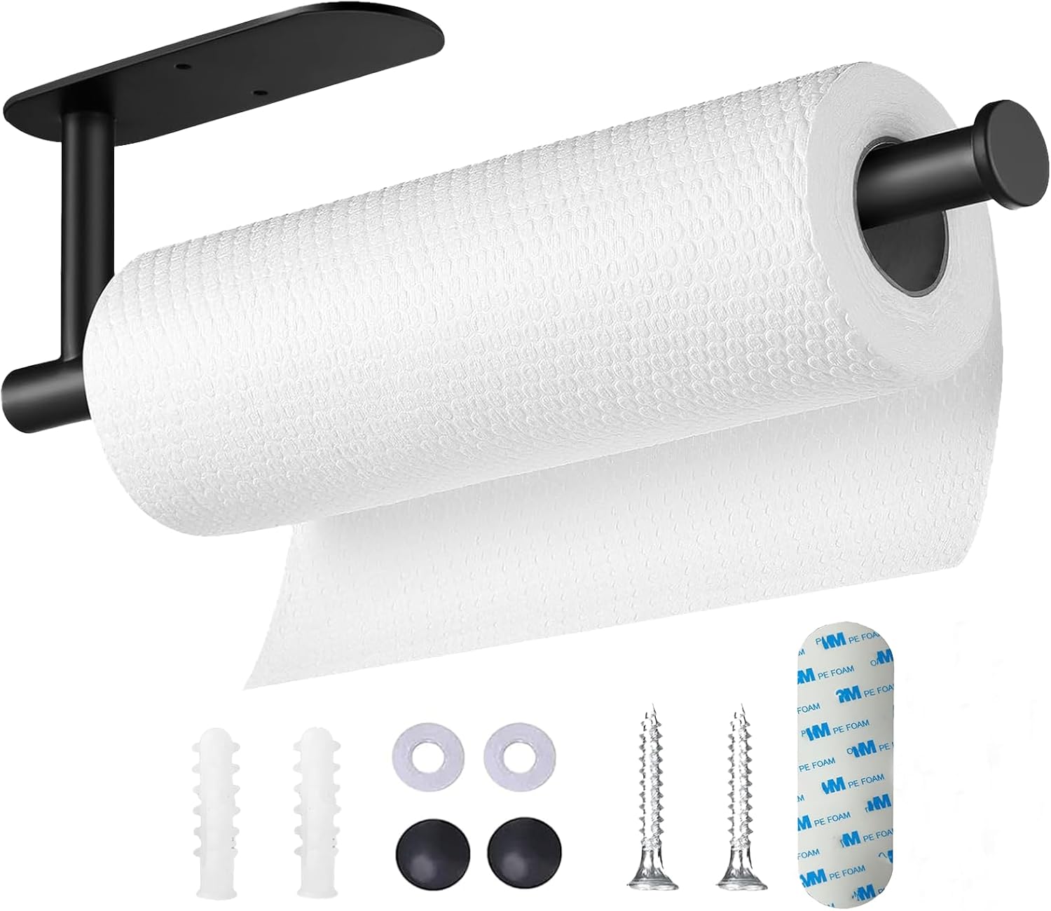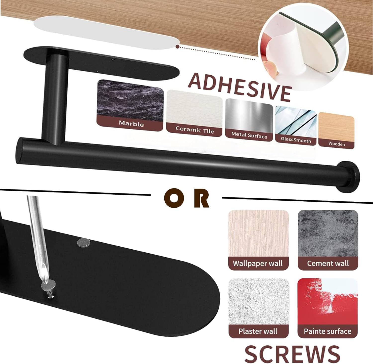 - MULTIPLE INSTALLATION METHODS : The kitchen paper towel holders has two installation methods,Self Adhesive and Drilling,we will provide installation instructions and installation kits. Sticking is suitable for smooth surfaces such as glass,tile, wood and metal;drilling is suitable for rough surfaces such as lime wall,wallpaper and painted wall.