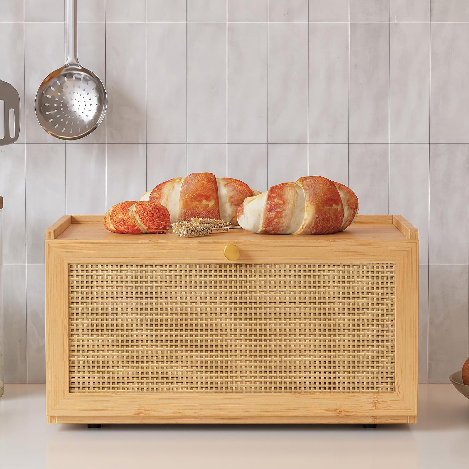 - Unique design and Spacious Storage: Measuring 15.75”L x 9.84”W x 8.27”H, this bread box offers plenty of room to hold bread, muffins, rolls, and more. The flat top design provides extra storage space for kitchen essentials.The rattan front door with golden handle,making it a practical and stylish addition to your kitchen