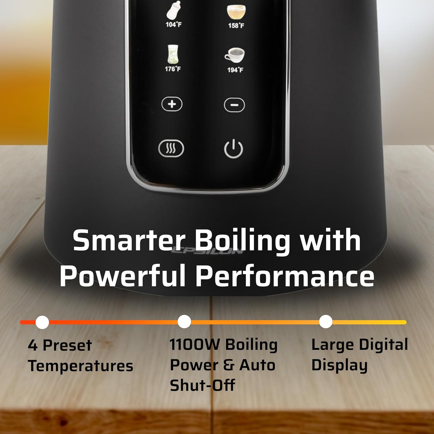- Boiling Point: The professional temperature controller has a built in automatic shut-off when water reaches boiling point. This precise control allows your epsilon electric kettle to reach the desired boiling point for your water or tea and then safely shut down. The EK also has a keep warm function preserving heat to 85 degrees.