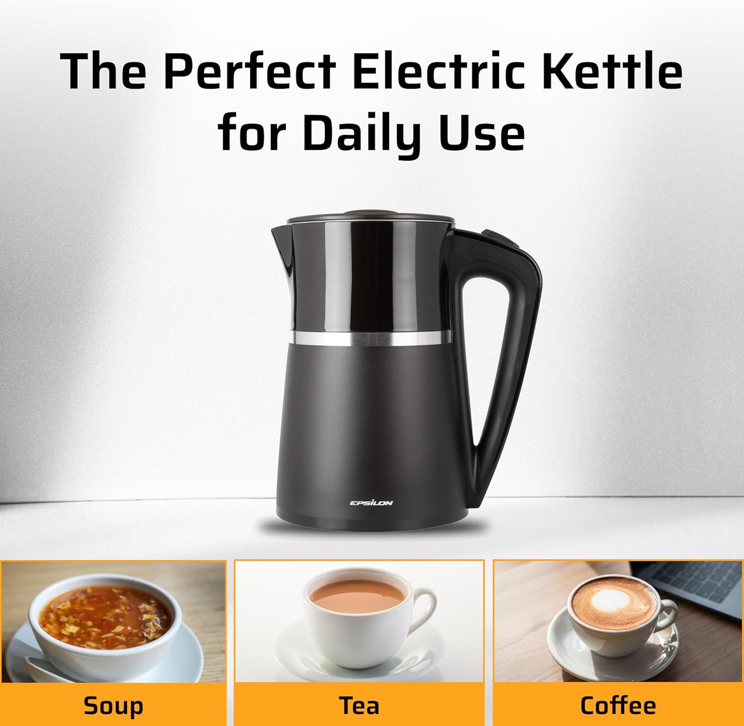 Epsilon Double Wall Electric Kettle 1500W – 1.7L Hot Water Tea Kettle & Hot Water Boiler with Auto Shut-Off, Boil Dry Protection, BPA-Free Stainless Steel Electric Teapot Fast Boil, Cool Touch Design