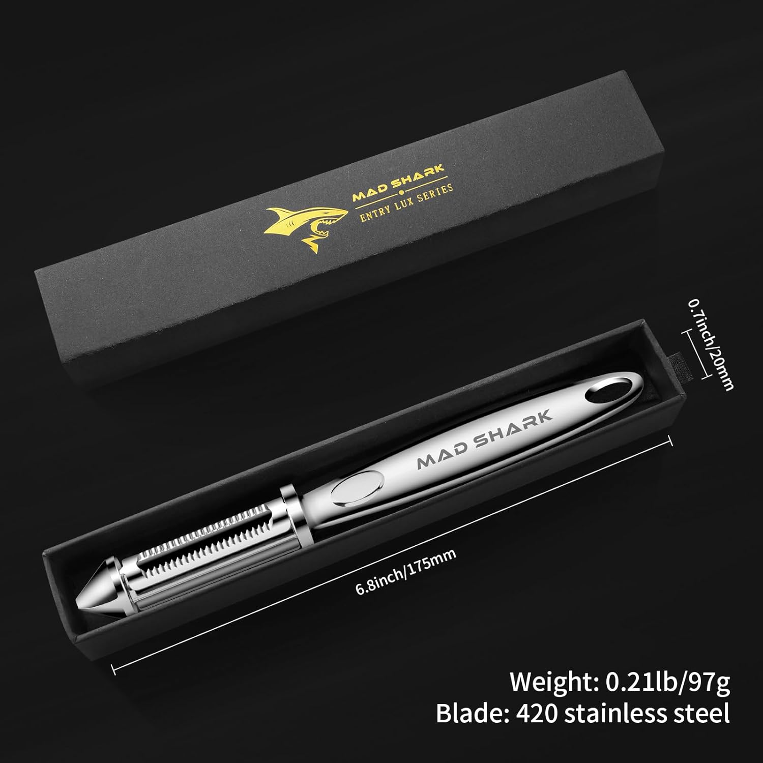 - HIGH QUALITY: Mad Shark vegetable peeler features premium 304 stainless steel blades and that are razor sharp to ensure easy peeling each times. This durable peeler is built to last, the blades are thickened to 1mm, which is thicker and more durable than regular blades.