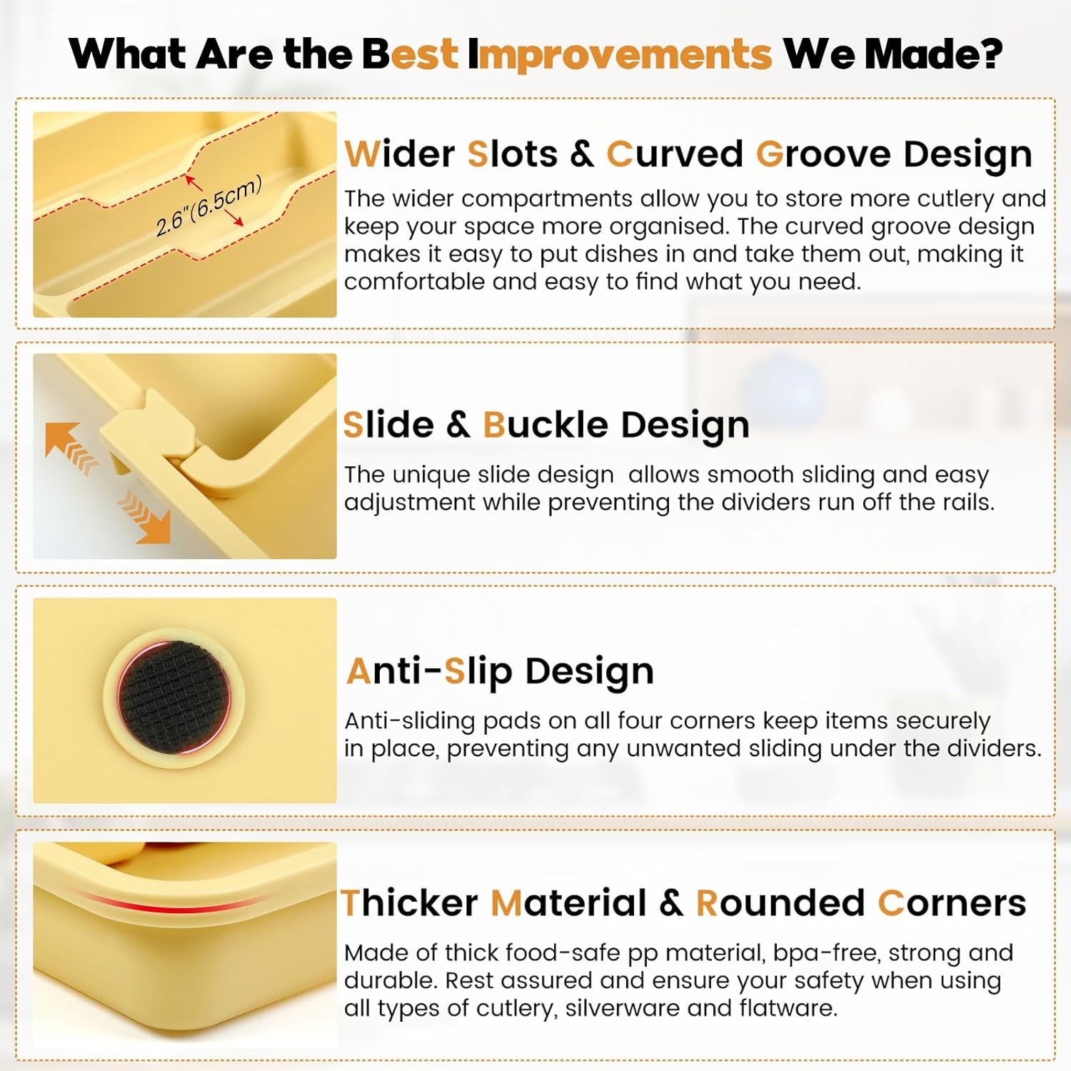 - Non-skid Silicone Feet: 8 strategically placed non-slip feets (not just four corners!) create superior grip on drawer surfaces. No more worrying about the flatware tray moving or tilting when you pull out the drawer.