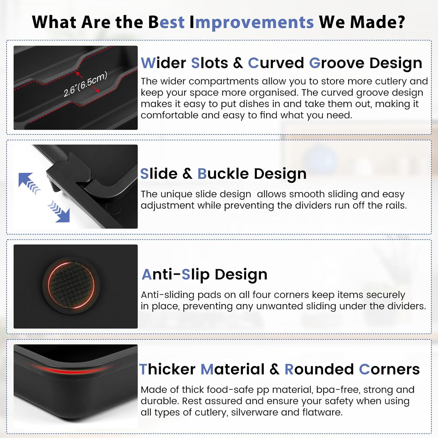 - Non-skid Silicone Feet: 8 strategically placed non-slip feets (not just four corners!) create superior grip on drawer surfaces. No more worrying about the flatware tray moving or tilting when you pull out the drawer.