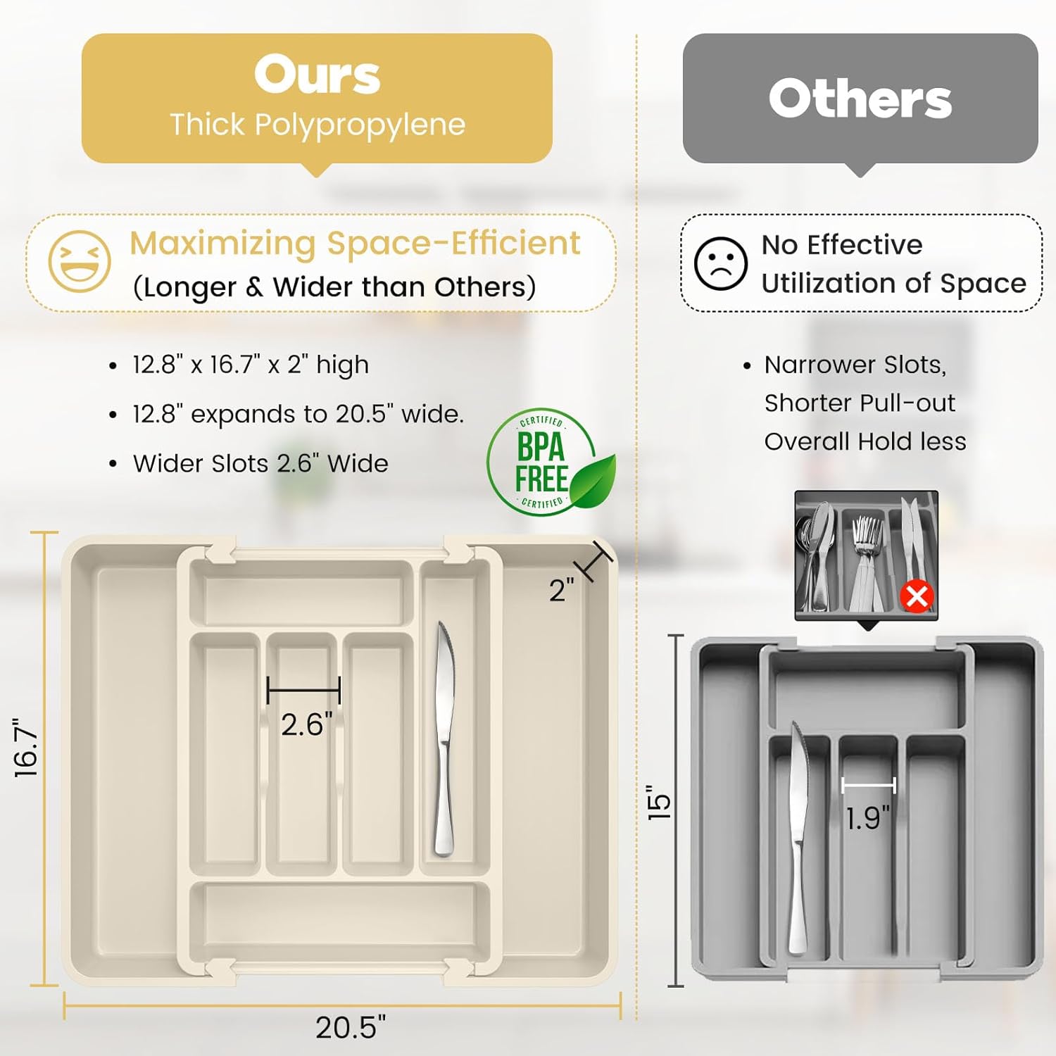 - Adjustable Width: Our expandable cutlery drawer organizer features 6 compartments when closed and 8 compartments when expanded. Measures 12.8" x 16.8" x 2" high; expands to 20 1/2" wide. Fits most standard-sized kitchen drawers.