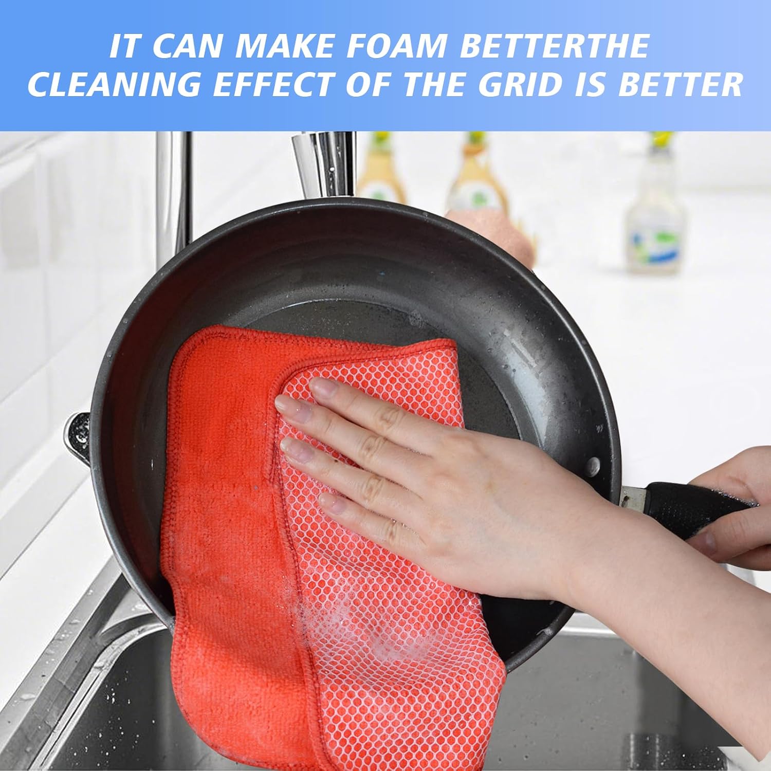 - DISH RAGS FOR KITCHEN CLEANING WITH POLY SCOUR SCRUBBING SIDE: One side is microfiber and the other side is mesh. The microfiber side works well at getting finger spots off the stainless steel appliances and the glass front of fridge or stove, microwave; the scrubby side is good for cleaning stuck on food without having to grab your scraper and does not scratch delicate surfaces either