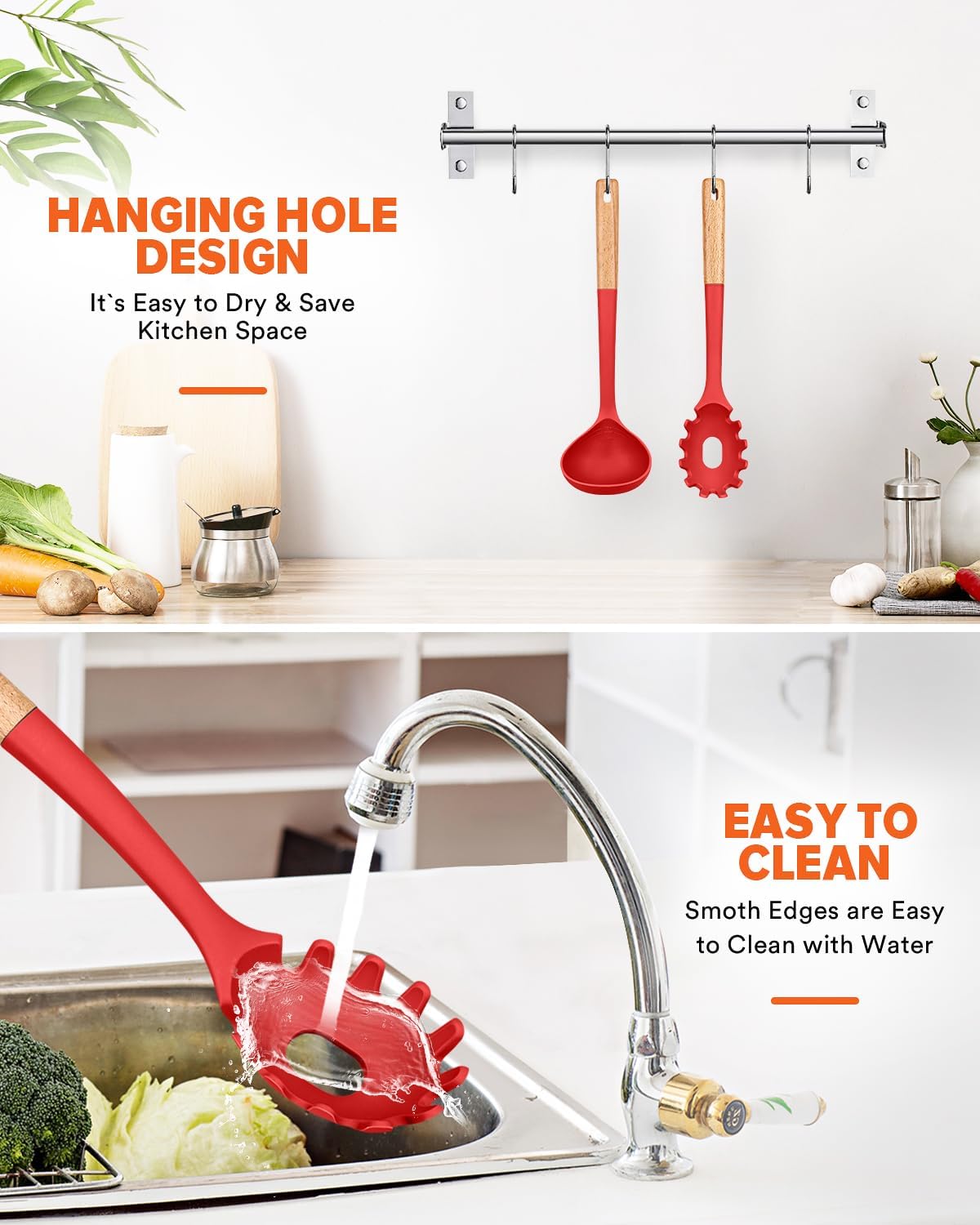 Pasta Fork and Ladle Set, Perfect for Serving Hot Soup, Stirring, and Sauce Pasta, BPA-Free Matte Silicone, Wood Handle Spaghetti Spoon for Nonstick Cooking Surfaces (Red)