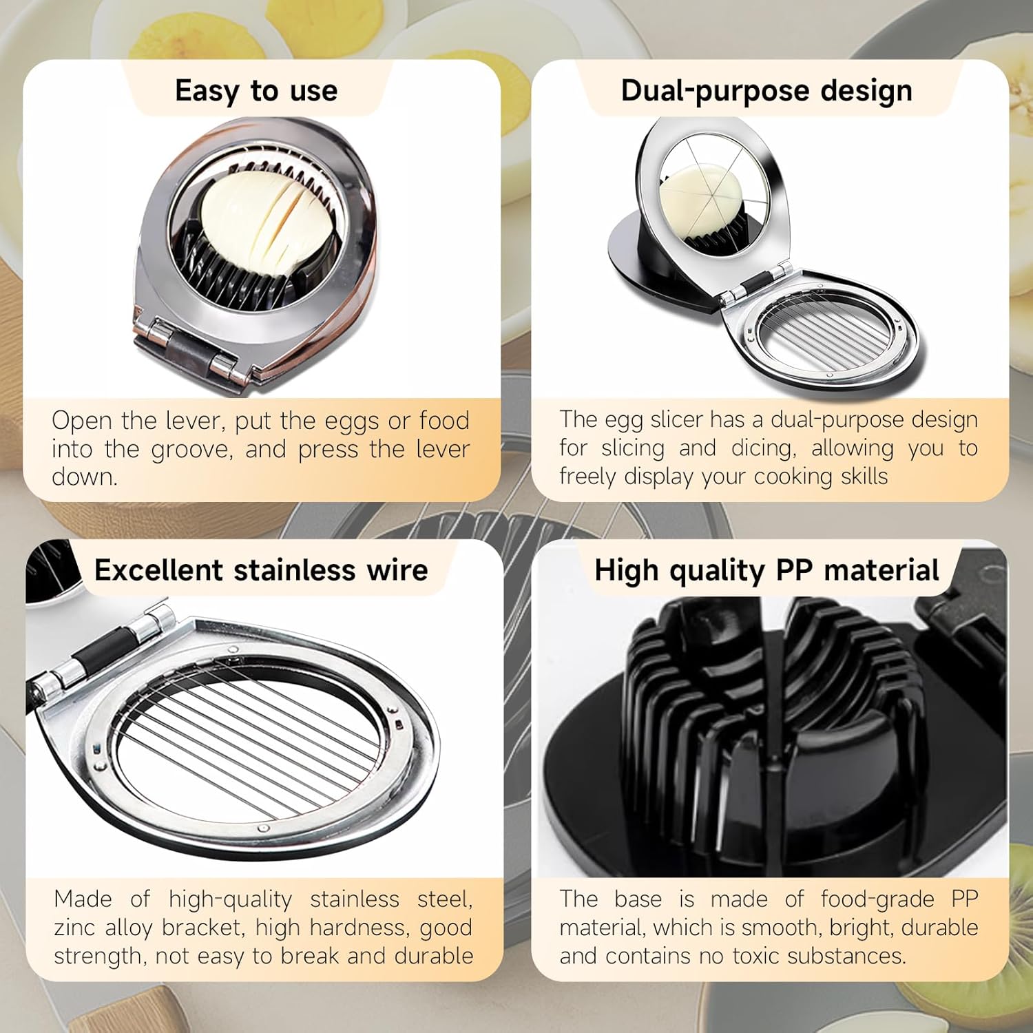 - Stainless Steel Wire and Rust-Resistant Construction:Made from aluminum and stainless steel wires, this egg slicer is built to last. The sturdy materials resist rust and wear, ensuring long-lasting performance for all your slicing needs