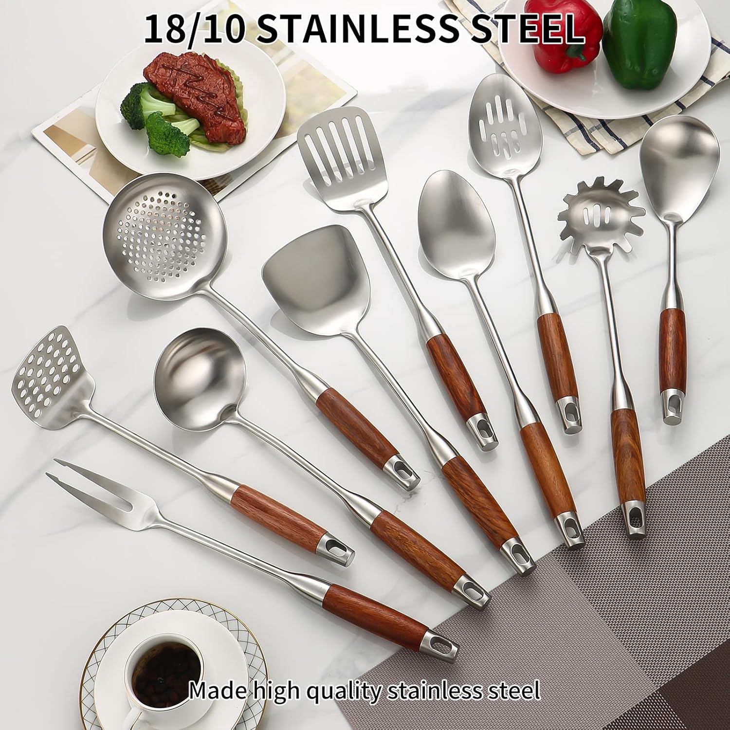 Stainless Steel Kitchen Utensils Set with Wood Handle, 18/10 Metal Cooking Utensils Set, 10-Piece - Spatula, Spoon, Ladle, Skimmer, Slotted Turners, Pasta Server, Fork, Masher(Dishwasher Safe)