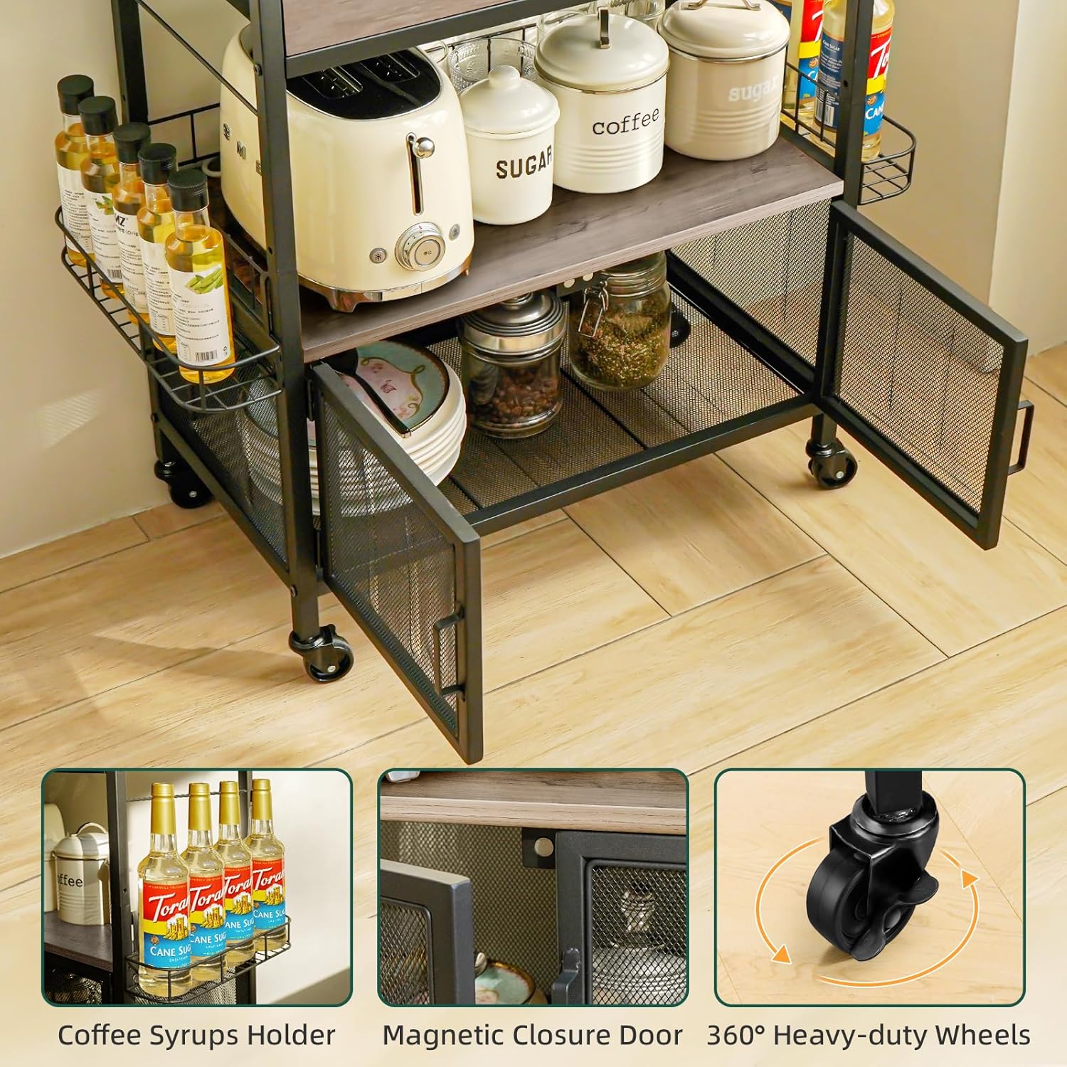- Multi-functional Space Organization: The tabletop of the coffee station fits for placing a coffee maker, coffee canister, a milk frother, a coffee grinder or a toaster for easy access. The middle shelf is suitable for a microwave, oven or bulk coffee beans. The bottom, with visual magnetic doors, securely stores fragile items to prevent damage. Additionally, one side baskets can hold 4-5 bottles of coffee syrup