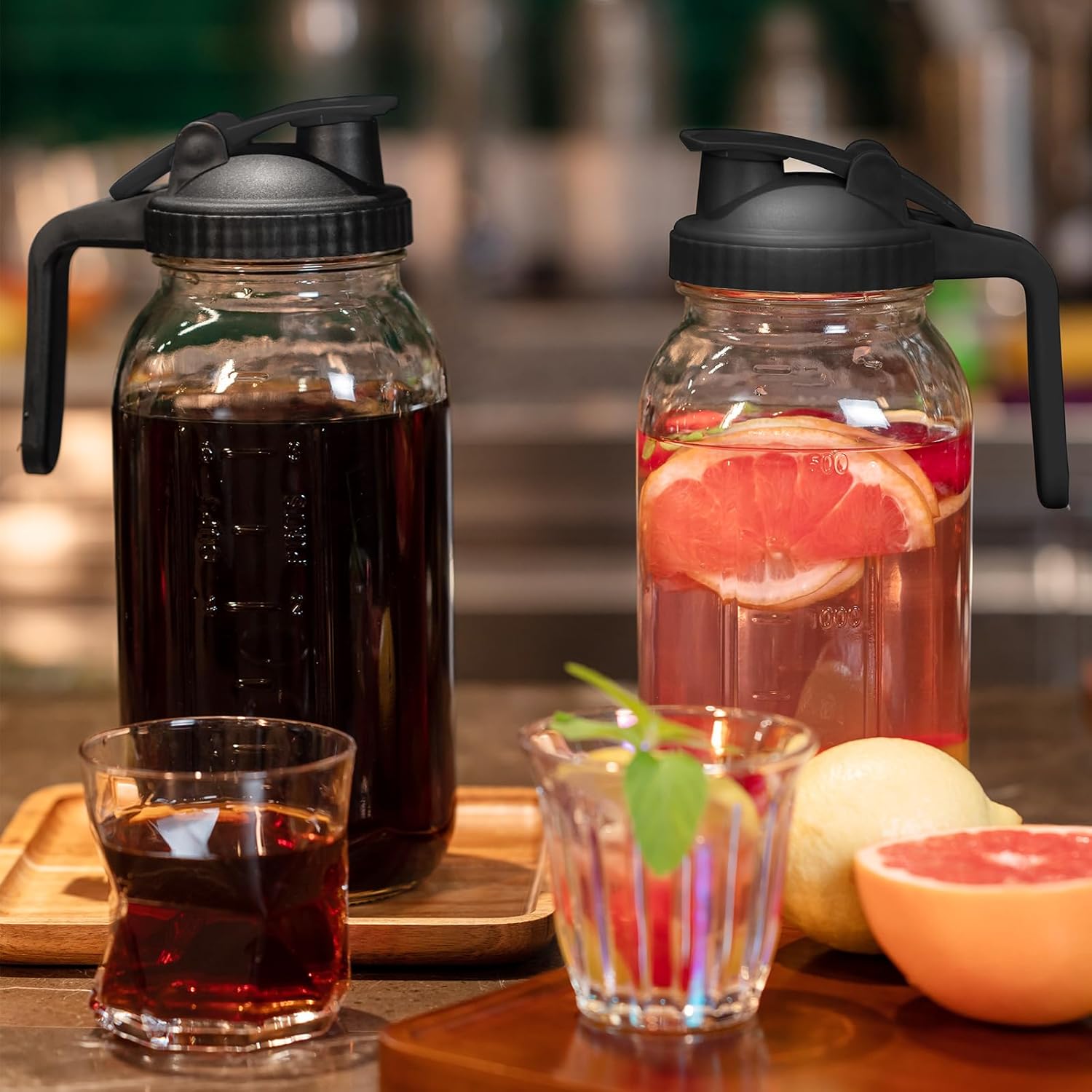 Glass Mason Jars Pitcher 64 Oz Pour Spout Lids & Handle (2 Pack) Wide Mouth Airtight Leak Proof Fridge Breast Milk Pitcher With Top Flip Cap 2 Quart Water Jug For Cold Brew Coffee, Iced Tea,