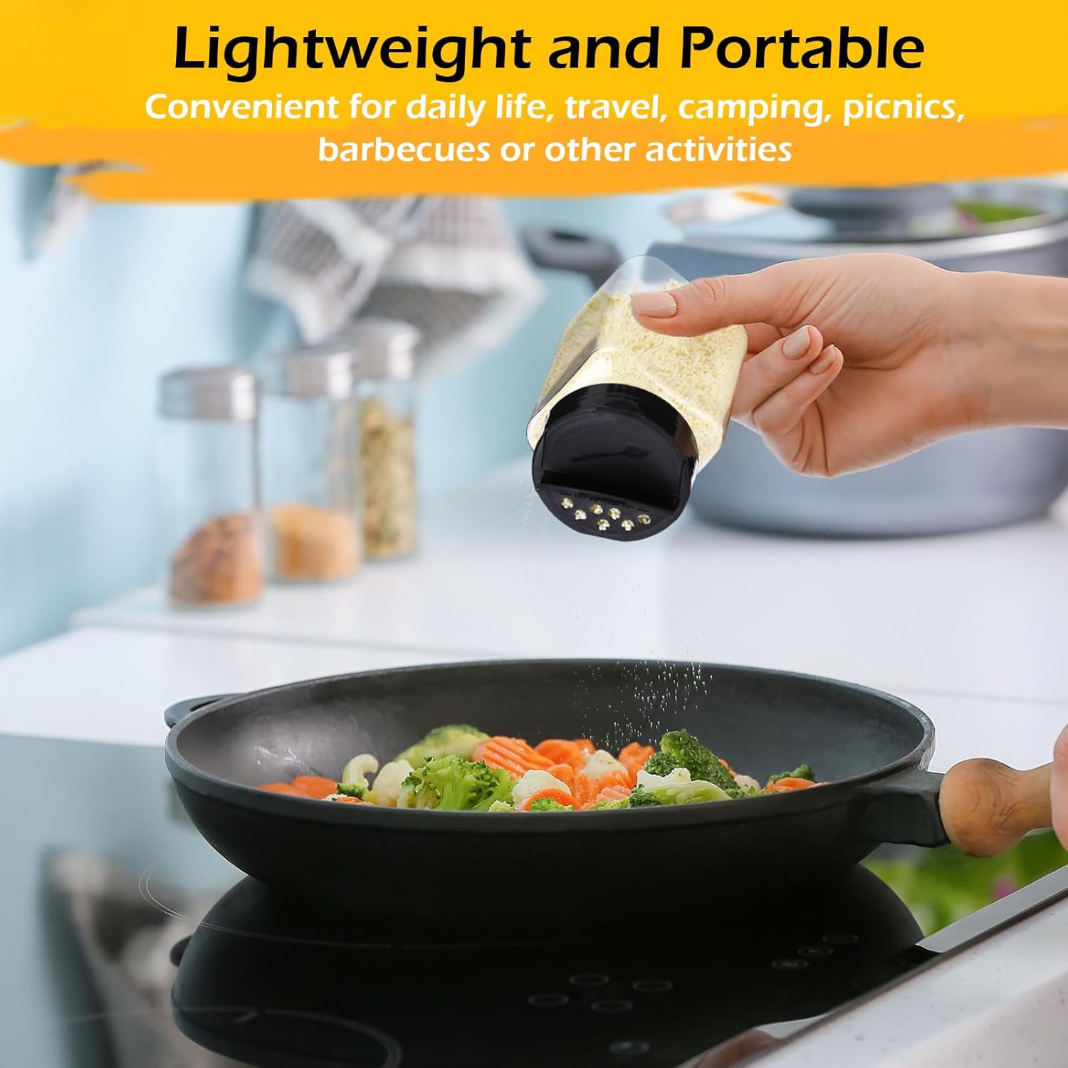 - 2 Independent Flip Lids: the flip lid design of the plastic seasoning container is smart and thoughtful, it can meet the precise amount of cooking, you can take it as you go, you don't have to remove the lid to measure the spices, if you just want to sprinkle the spices, the holes on the side of the shaker are large enough to allow dried herbs to pass through