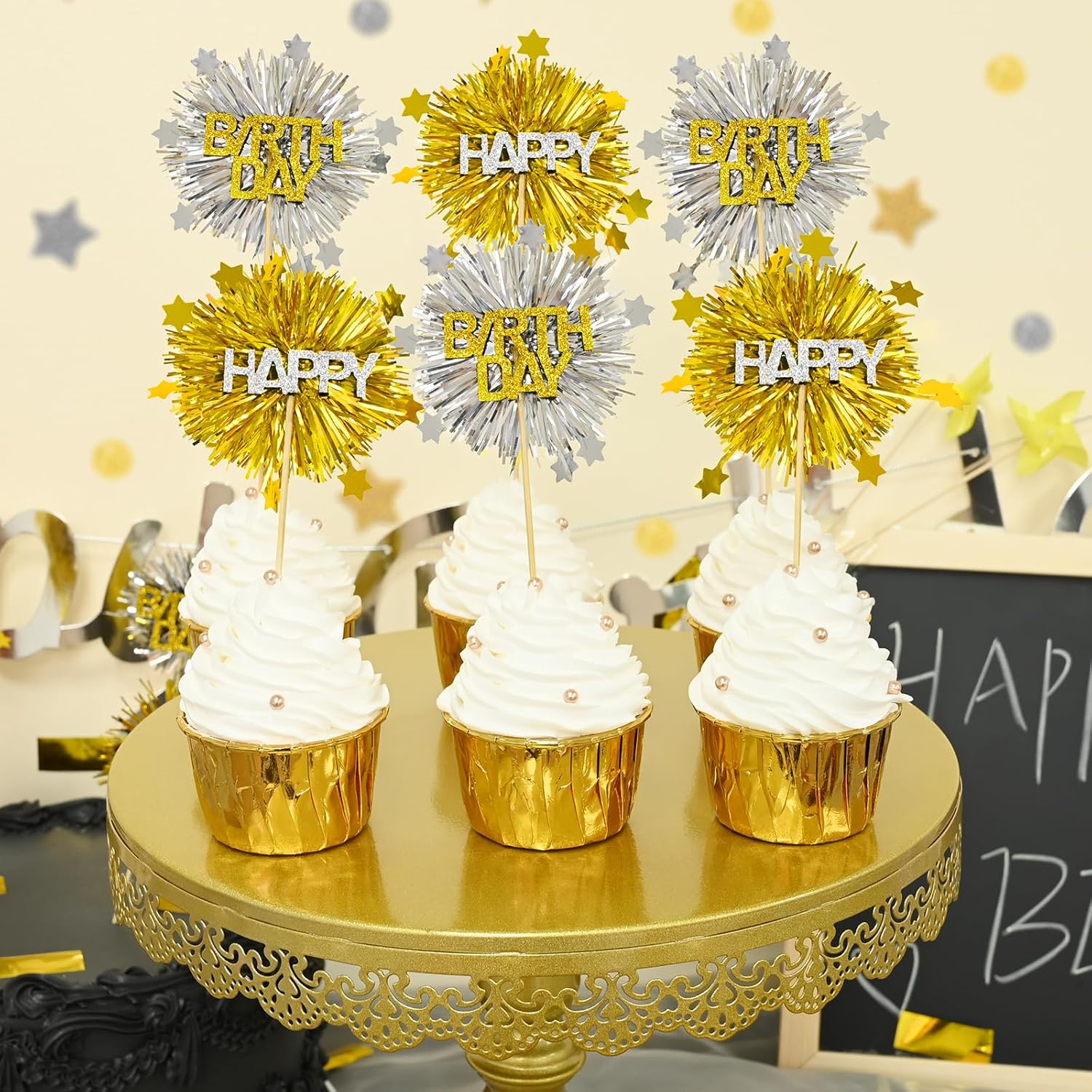 - đăCUPCAKE TOPPERSă: 12 pcs gold and silver sparkling centerpieces toppers, with a unique font and foil fringe design, perfect for birthday party decorations and make your cakes more gorgeous!