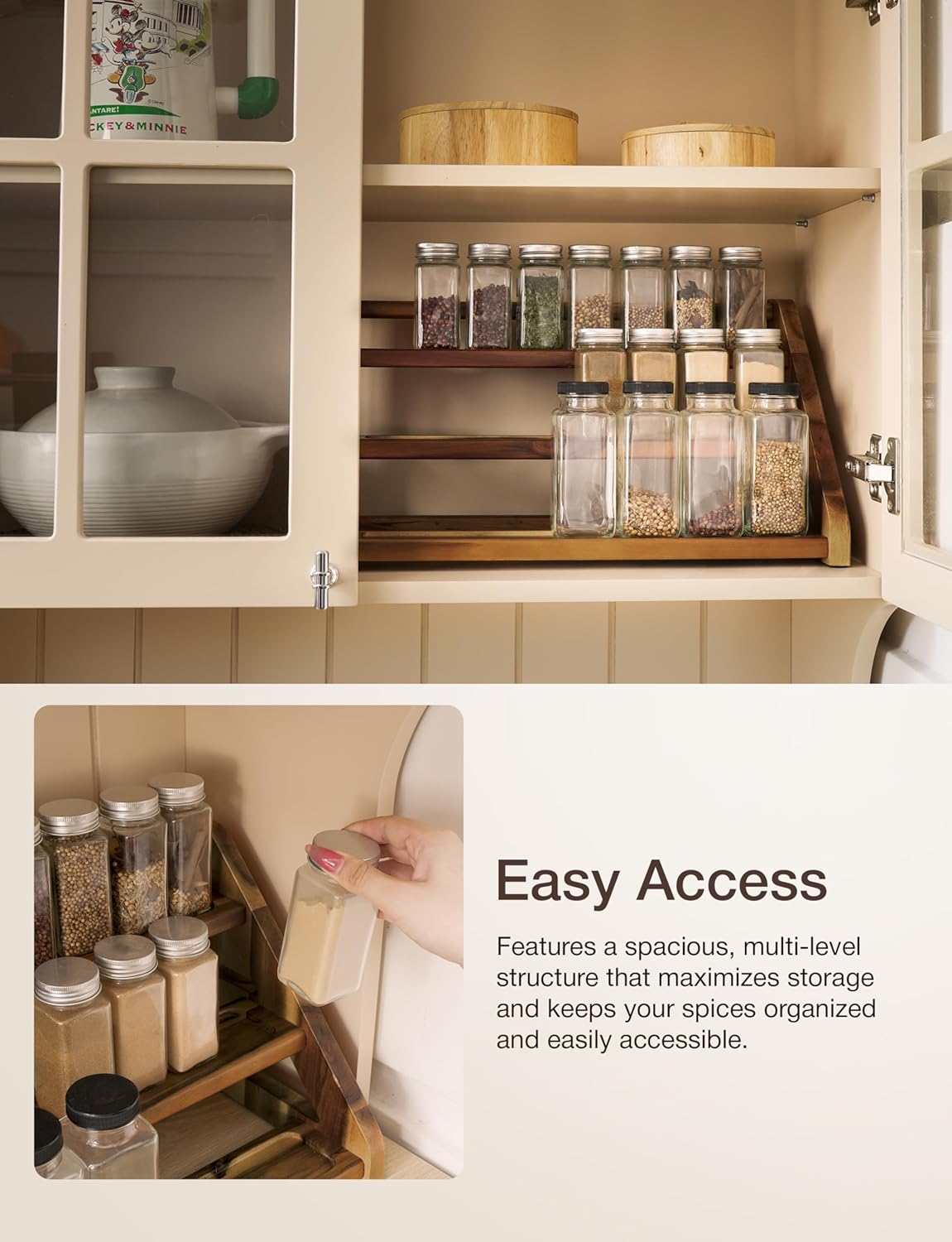- Spacious Spice Rack Organizer for Cabinet: Designed with a three-tiered structure, this 3 tiered spice rack maximizes vertical space, holding up to 24 spice jars to keep your kitchen cabinet or pantry tidy and your favorite seasonings within easy reach. Note: Jars not included