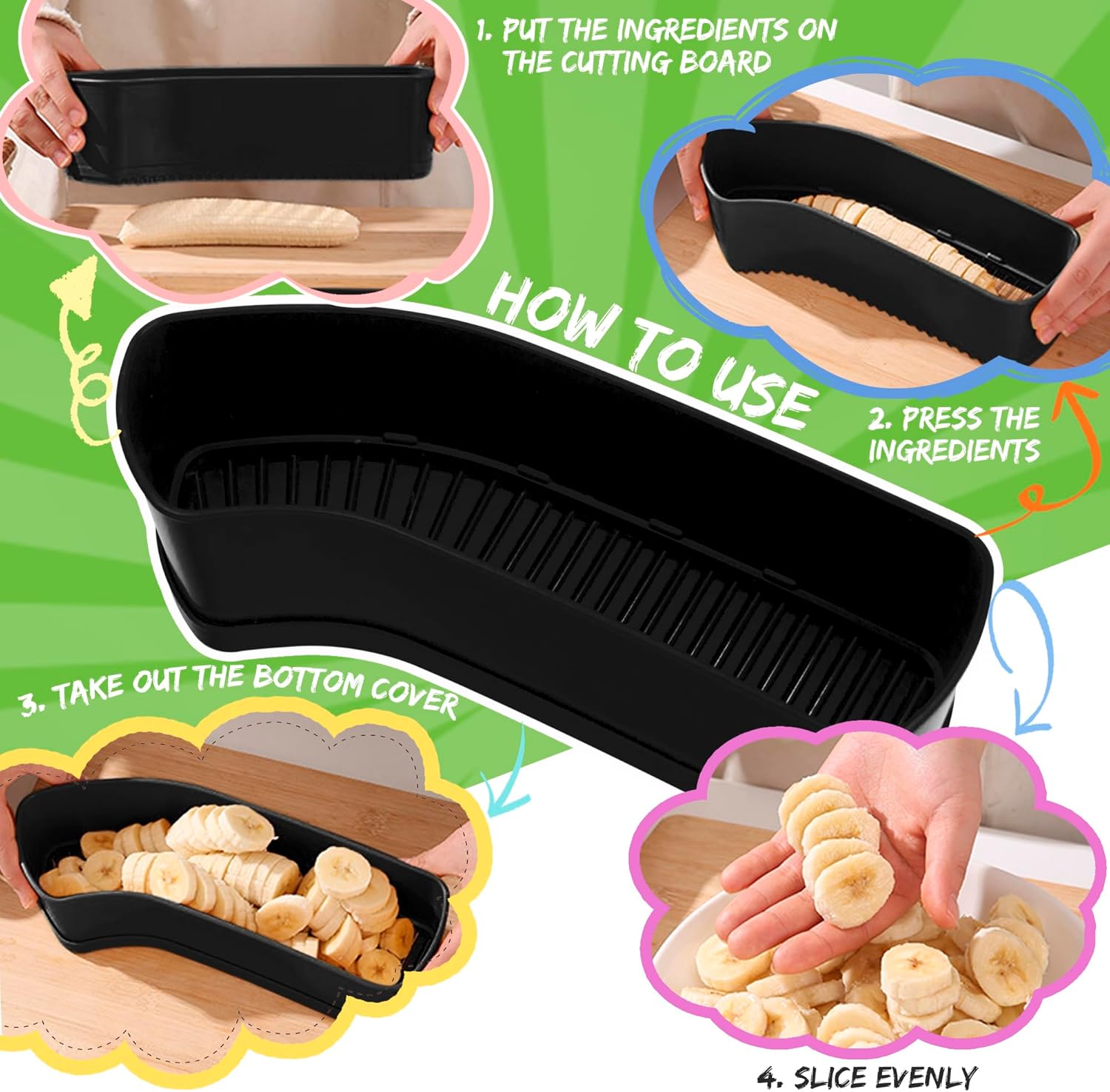 - 4. Effortless & Safe to Use – Simply place your banana, strawberry, or other ingredients into the slicer and press down for instant, uniform cuts. No more messy chopping or uneven slices—just quick, consistent results with no risk of knife slips!