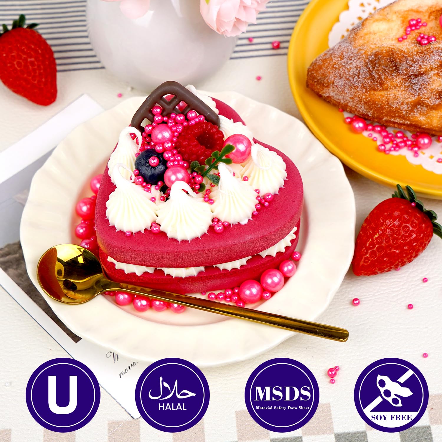 - Edible Pink Pearl Sprinkles with food-grade raw materials. Preservative Free, Nut Free, Dairy Free, Chemical Free, Soy Free, Non-GMO. Produced using food-safe standards, the process does not come into contact with allergenic substances and uses Tamper-proof food label. Have Kosher and Halal Certification.