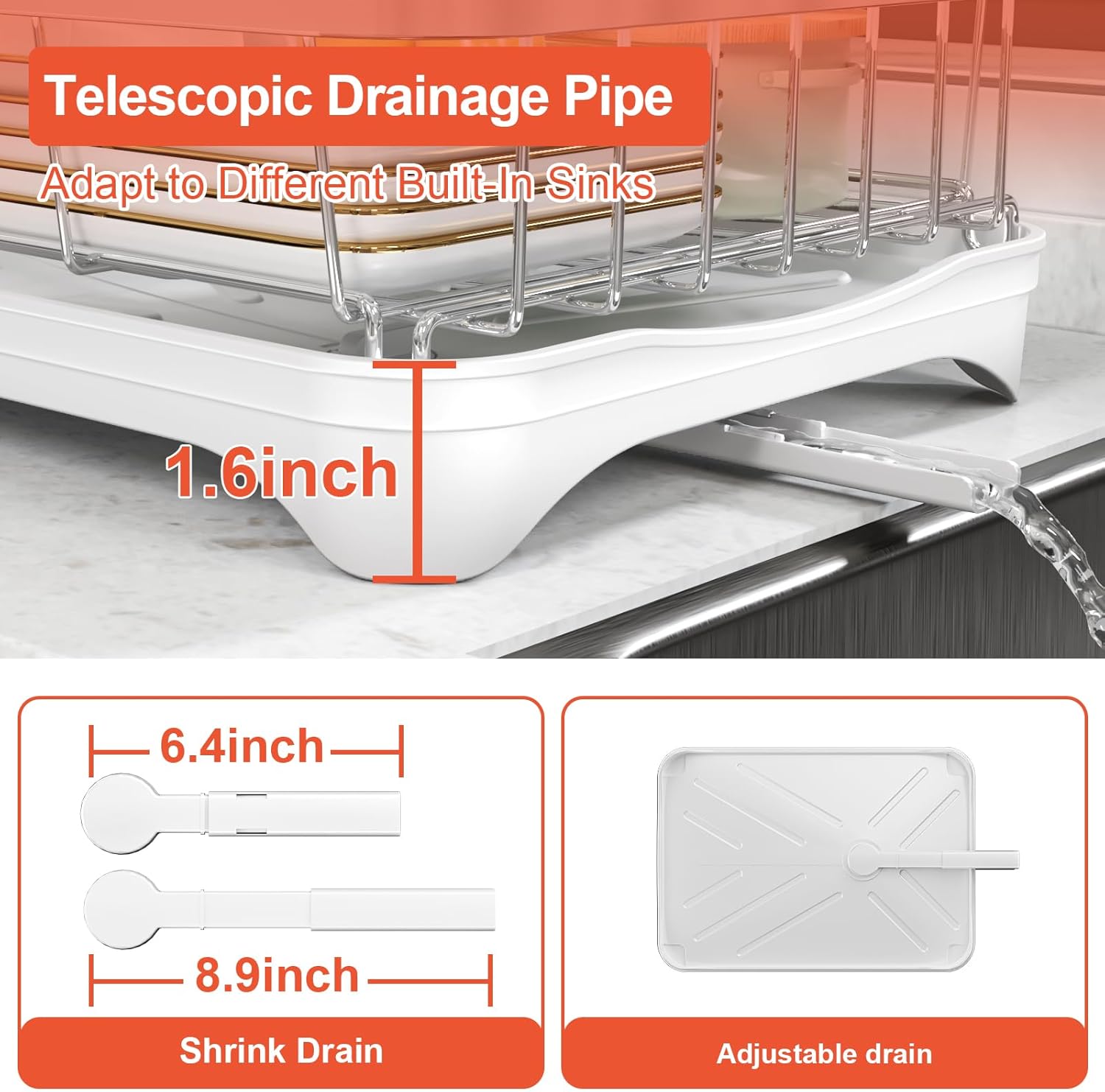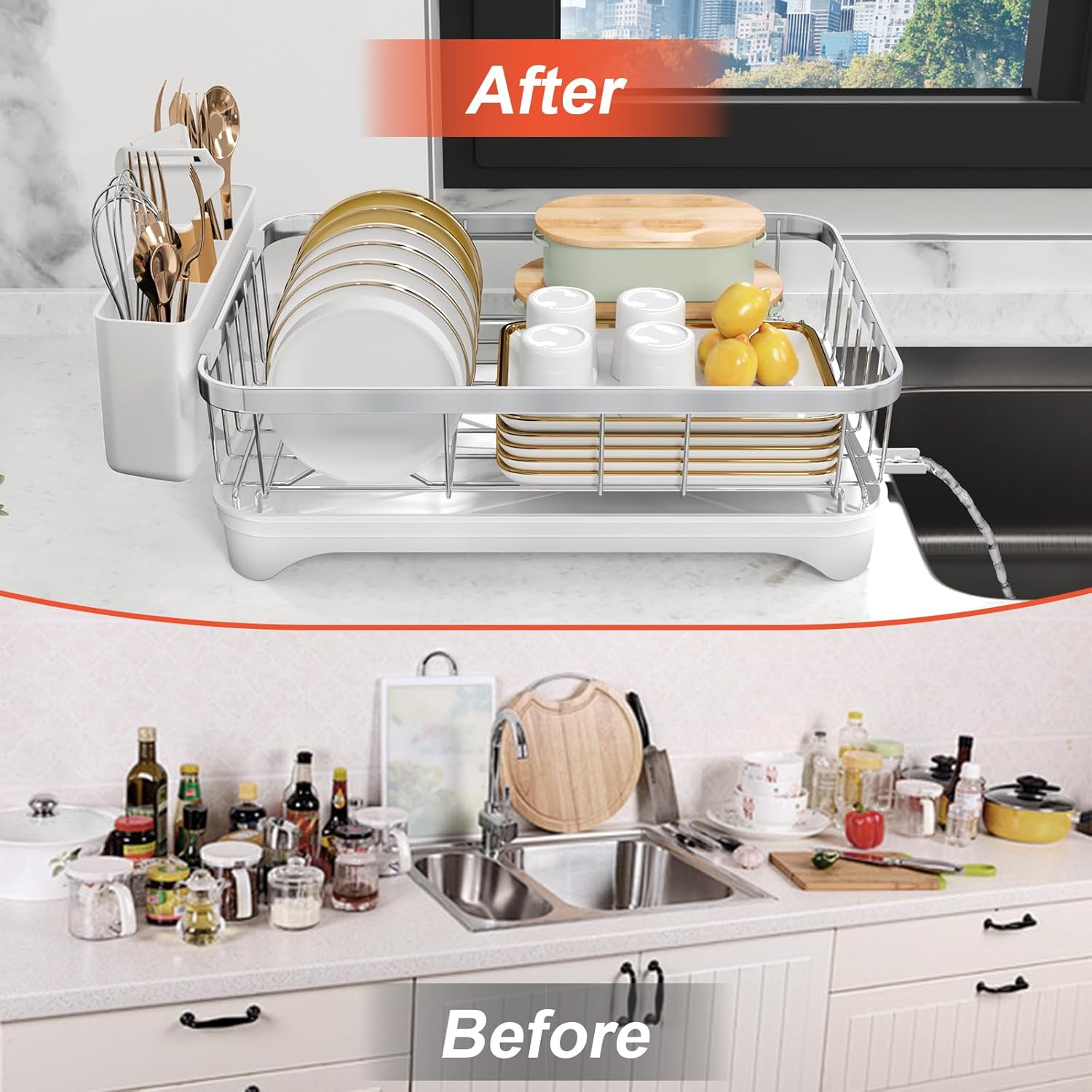 Dish Drying Rack - 304 Stainless Steel Dish Rack with Utensil Holder & Adjustable Spout, Space-Saving Organizer, Large Capacity for Bowls, Dish Drainer with Drainboard, White