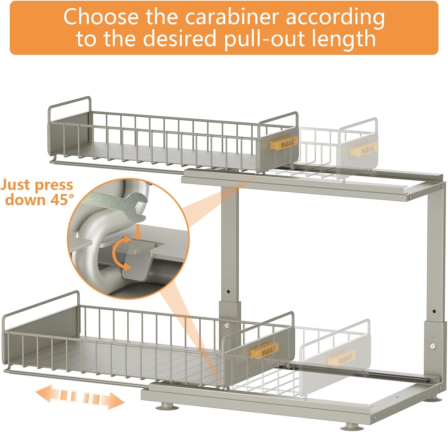 - Double Pull-Out: Pull out cabinet organizer smooth, quiet sliding tiers maximize vertical space, providing double the storage capacity under the sink while still allowing ready access to items