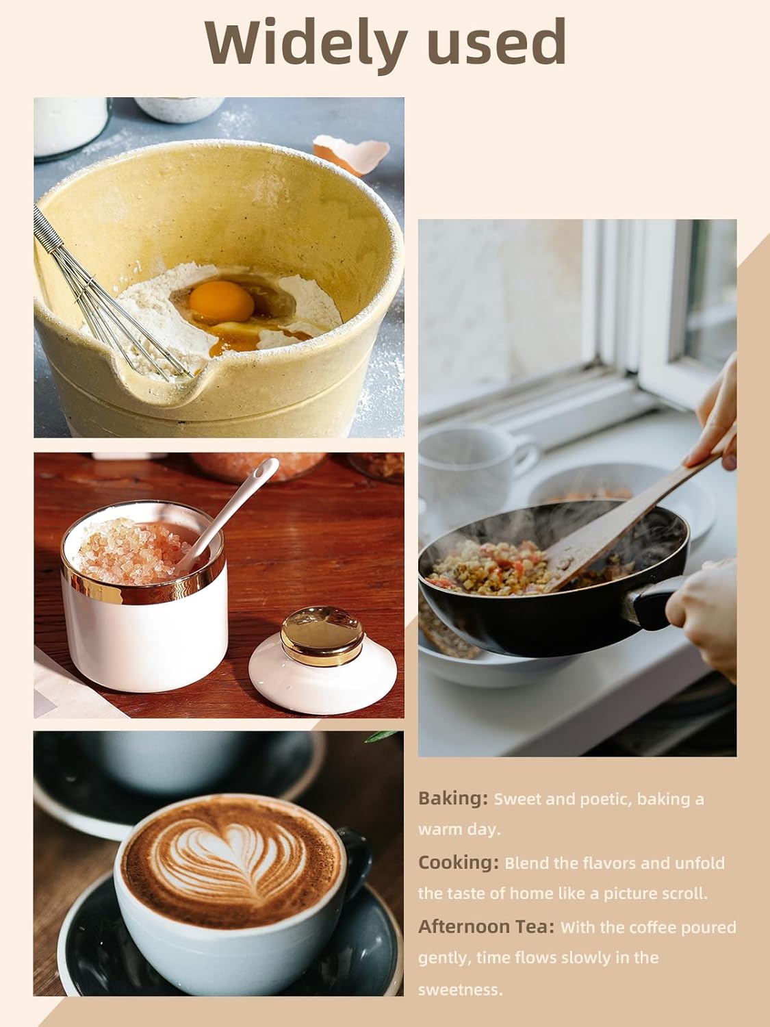 - DESIGN CONCEPT: This simple sugar bowl is equipped with a lid and a small spoon. The lid can keep your ingredients away from dust. There is a perfect notch on the lid for placing the spoon, so you don’t have to worry about placing the spoon randomly
