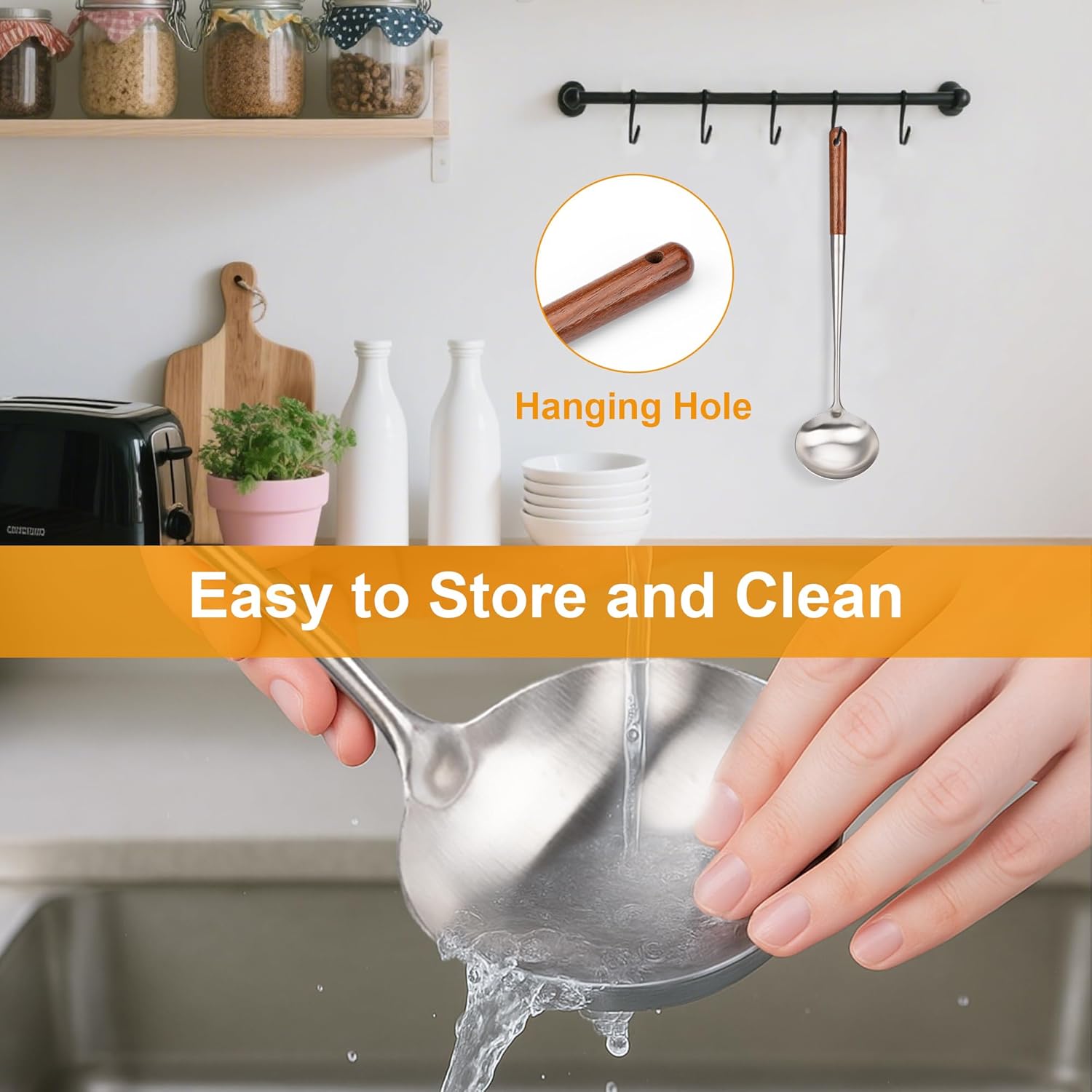 - Premium Wok Ladle : Crafted from high-quality, food-grade 18/8 stainless steel, this soup ladle resists rust, corrosion, and stains, ensuring long-lasting durability for daily use in soups, sauces, or batters.