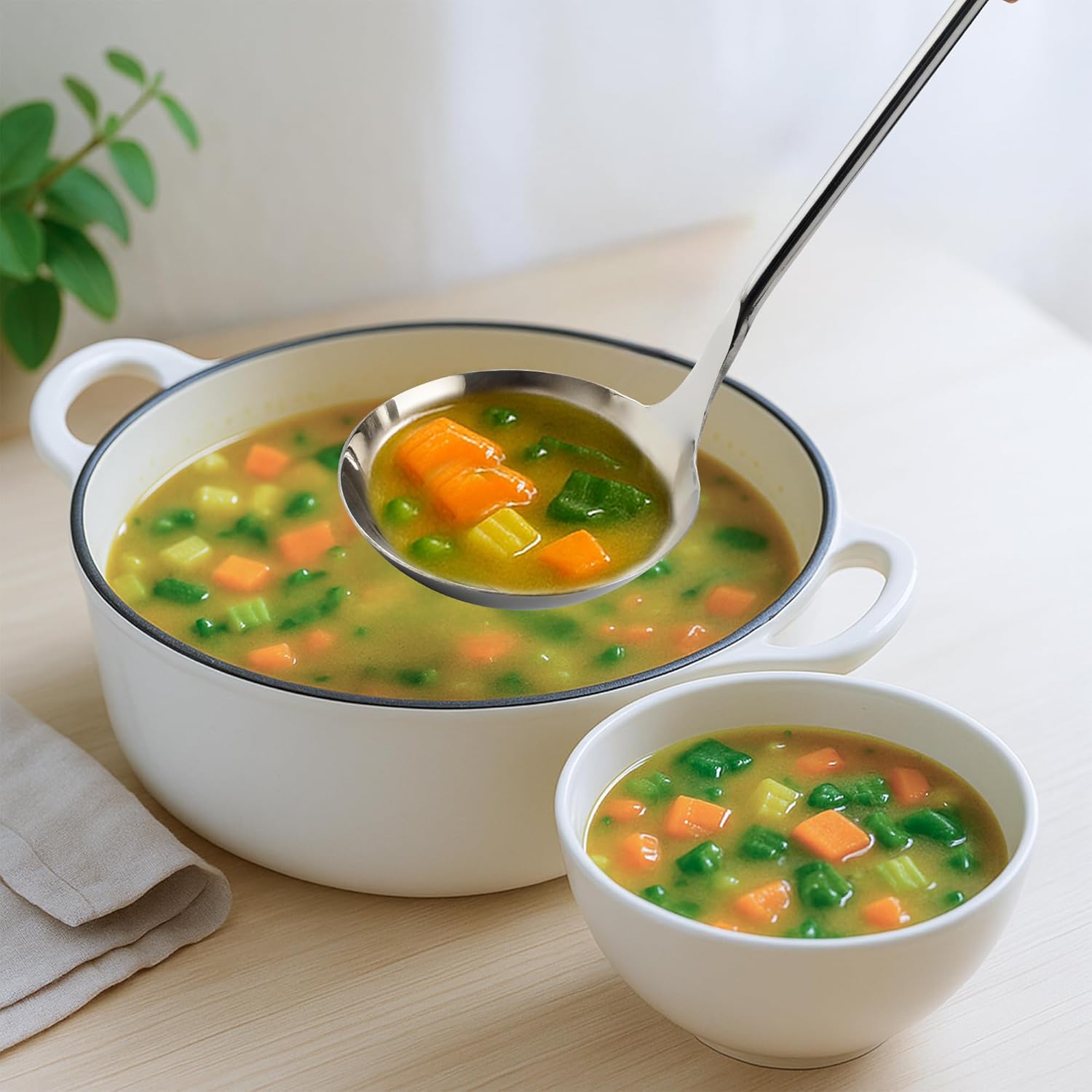 - Premium Stainless Steel Ladle : Crafted from high-quality, food-grade 18/8 stainless steel, this soup ladle resists rust, corrosion, and stains, ensuring long-lasting durability for daily use in soups, sauces, or batters.