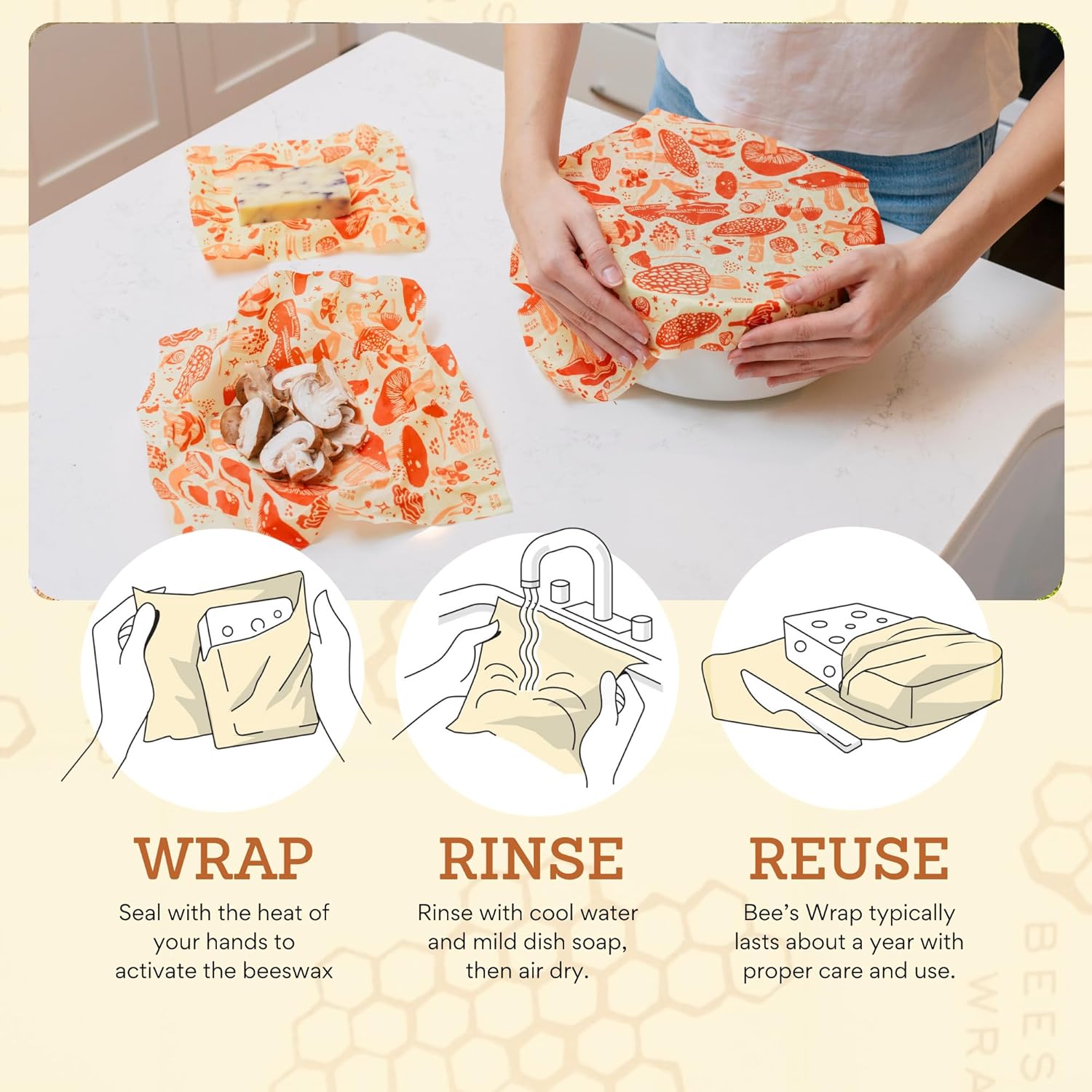 Bee's Wrap Beeswax Wraps for Food - Mushroom Magic 3 Pack (S, M, L) Made in USA Reusable & Organic Food Wraps, Sandwich Wrap & Bowl Covers - Eco-Friendly Alternative to Aluminum Foil & Plastic Wrap