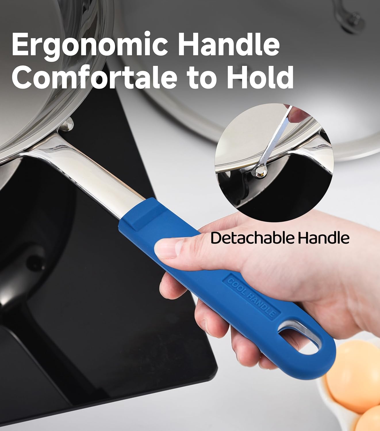 - 【KITCHEN PARTNER】The skillet equipped with a detachable stainless steel solid handle features a heat-resistant silicone sleeve to reduce heat transfer, making sure you don’t get burned while cooking. The clear lid stays on tight, making it easy to monitor your meals at all times.