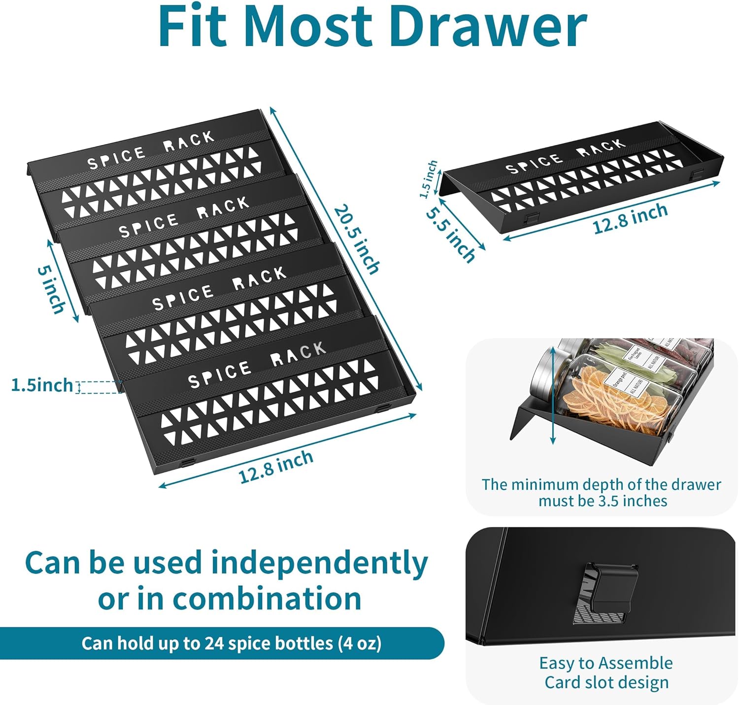 - Easy to Install with a Variety of Drawer Size: The spice drawer organizer insert fits most drawers that are over 5 inches depth and 13 inches wide( >5" depth x 13" width). Slot installation is easy,you just need to snap into the corresponding slot, can be a perfect fit, no need any tools.. This design makes the product widely applicable, whether it is a large drawer in the kitchen or a small drawer in the vanity, it can be easily installed and used, so that your storage space can be fully utilized, and at the same time, avoiding the complicated installation process, so that you can easily have a neat and orderly storage environment.