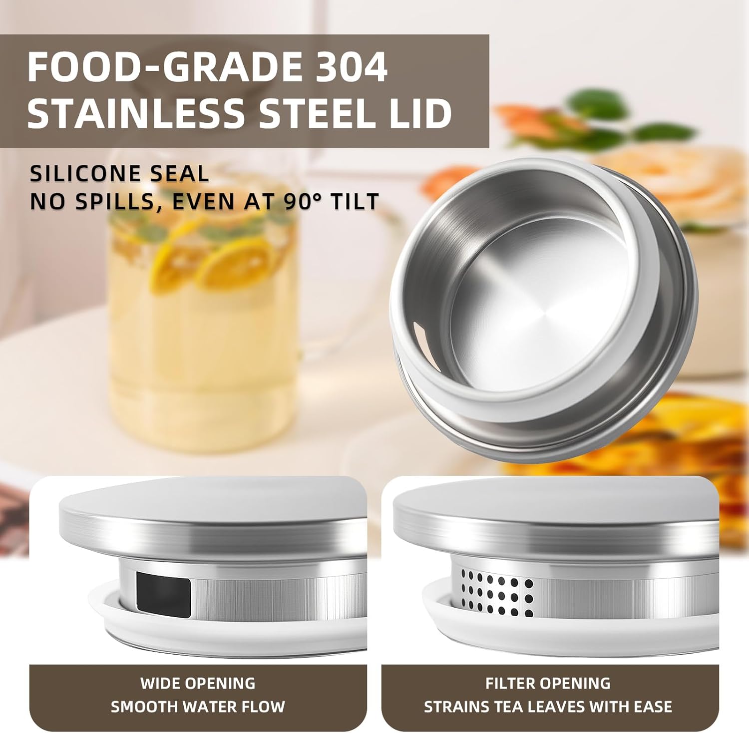 - Functional rust-proof stainless-steel lid: 304 stainless steel lid features 2-way outlets with large holes and small holes for filtration. It’s quite multi-functional for family use. The food-grade rubber ring makes sure the lid is tight and does not fall off while pouring.