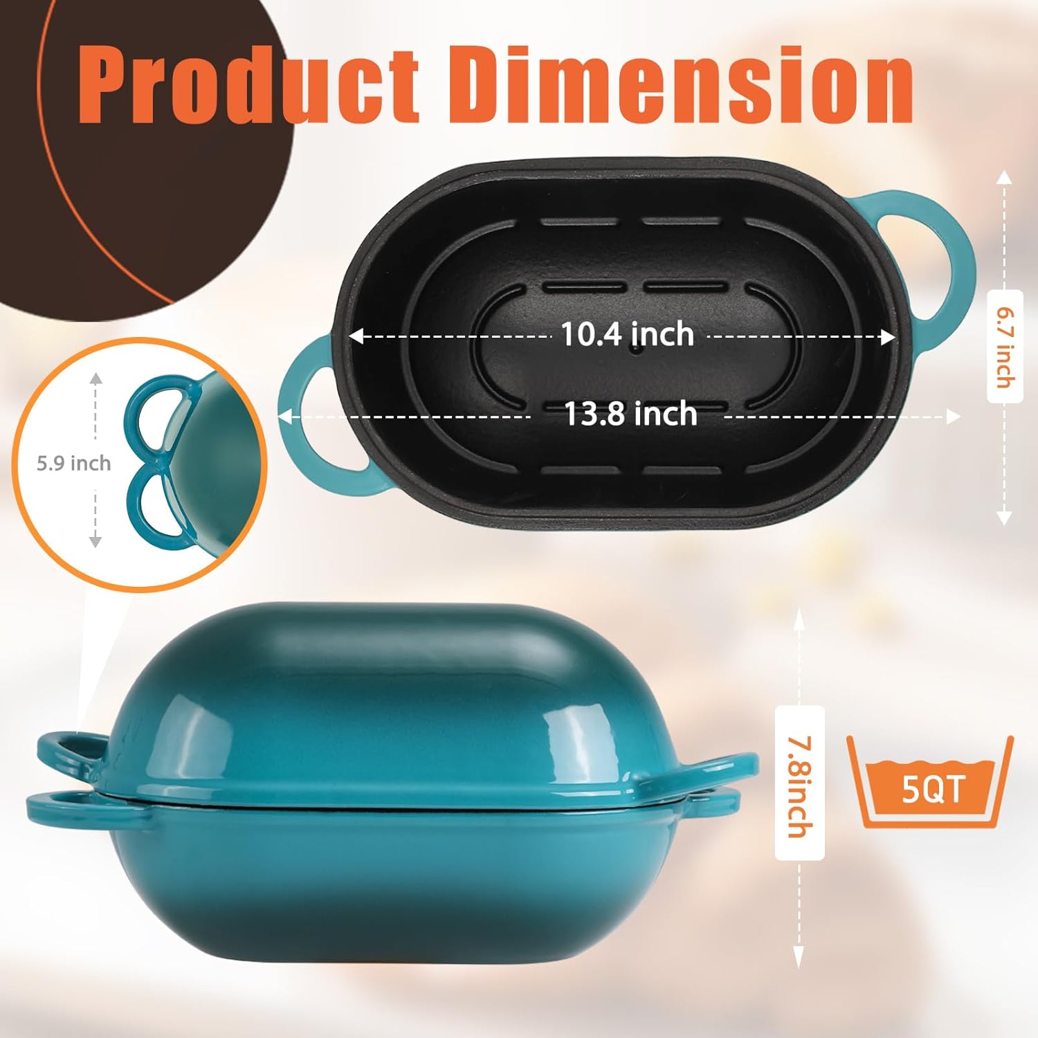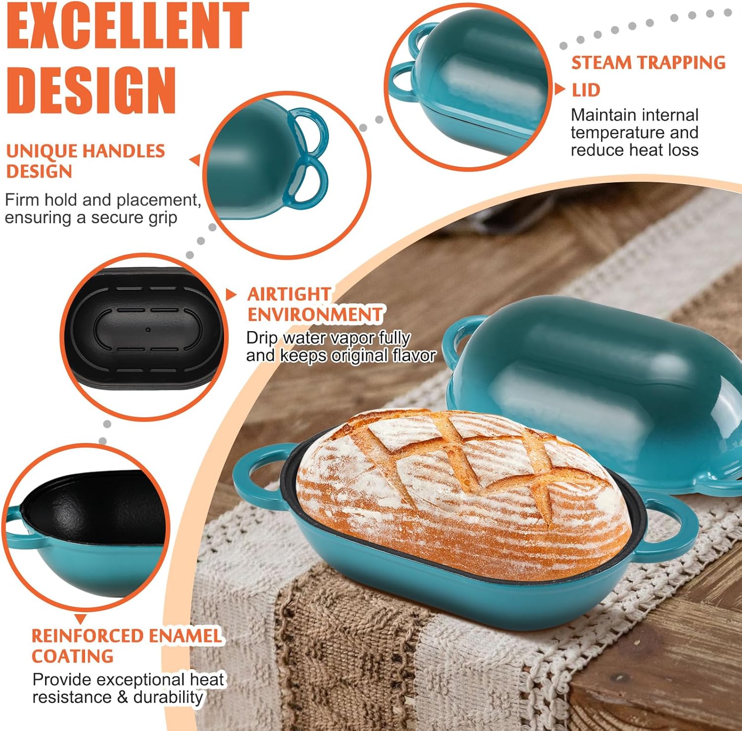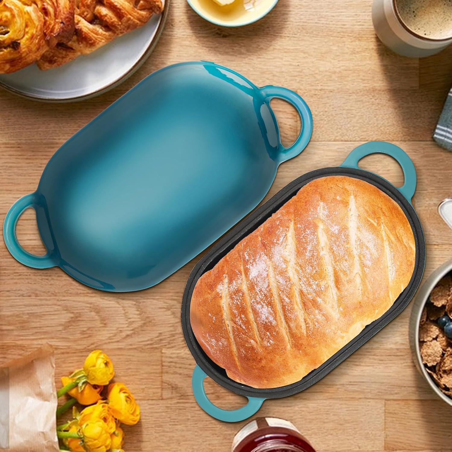 Enameled Cast Iron Bread Oven, 5QT Loaf Cast Iron Bread Pan with Lid, Oval Dutch Oven for Homemade Bread Baking (Gradient Blue-green)