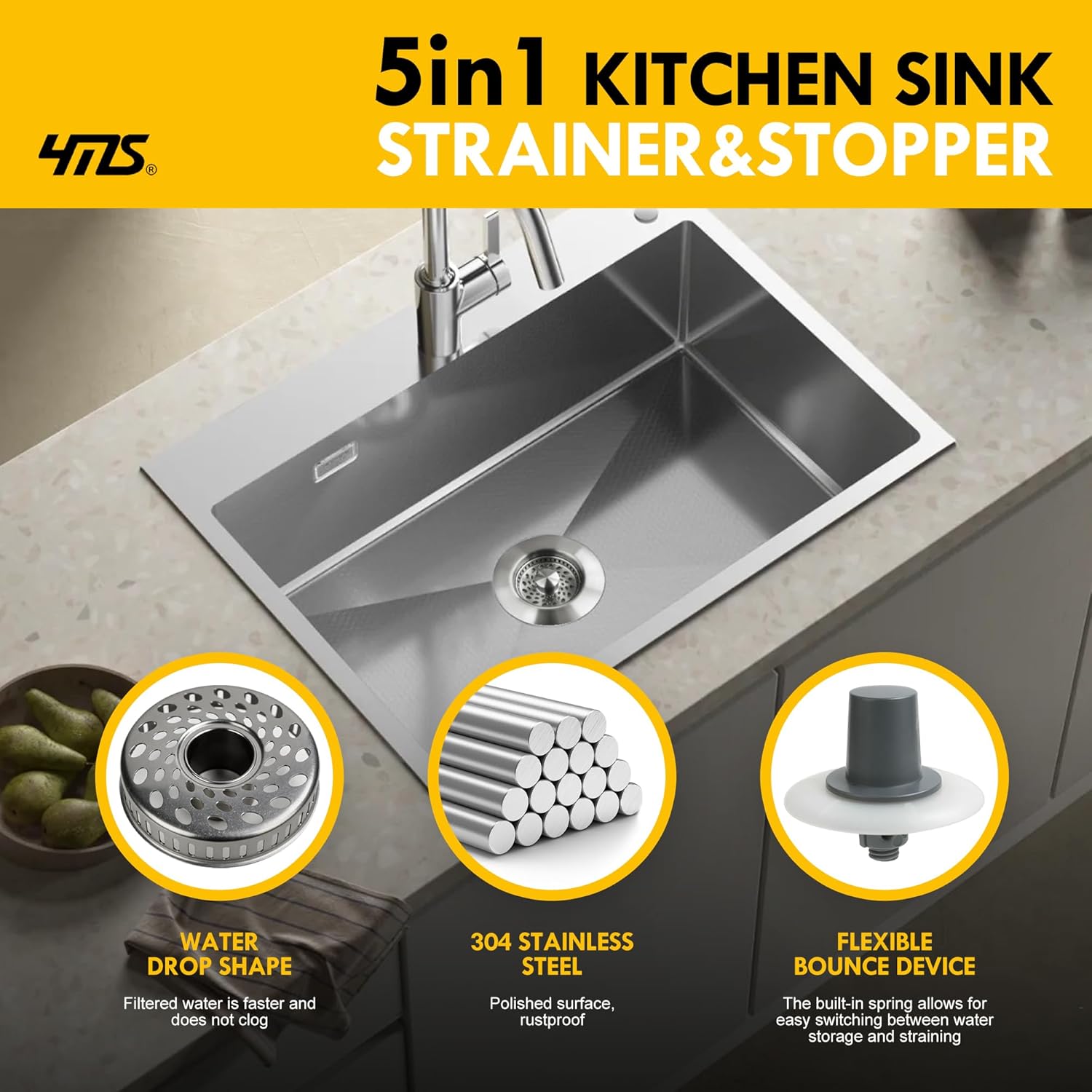 - MULTI-FUNCTIONAL DESIGN: 5-in-1 sink strainer combines drain stopper, food catcher, and odor filter in one convenient kitchen accessory
