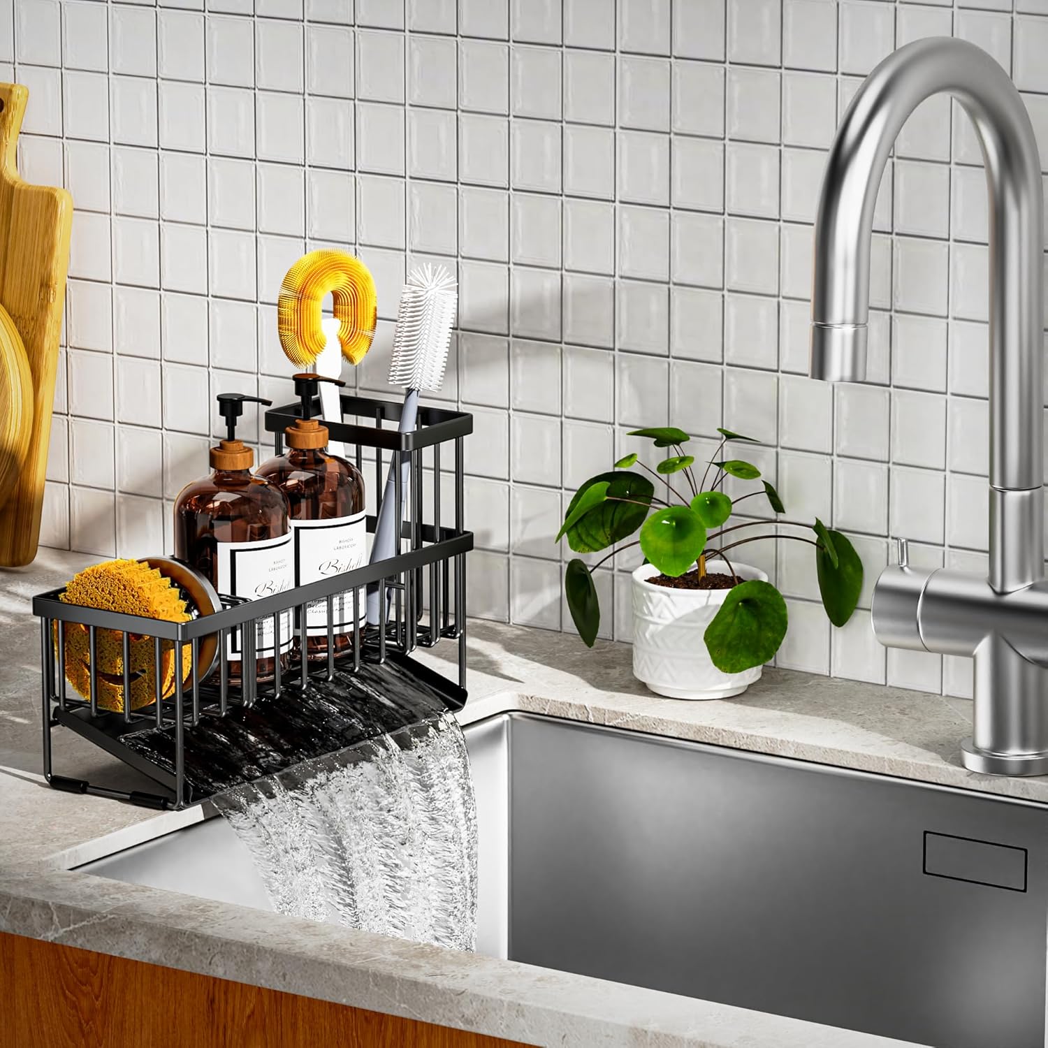 - ăPREMIUM STURDY MATERIALă Cisily kitchen sink organizer is made of premium stainless steel which can effectively prevent rust and deformation. And you can clean it easily by rinsing it under a running tap. Take the clutter out of your countertops.