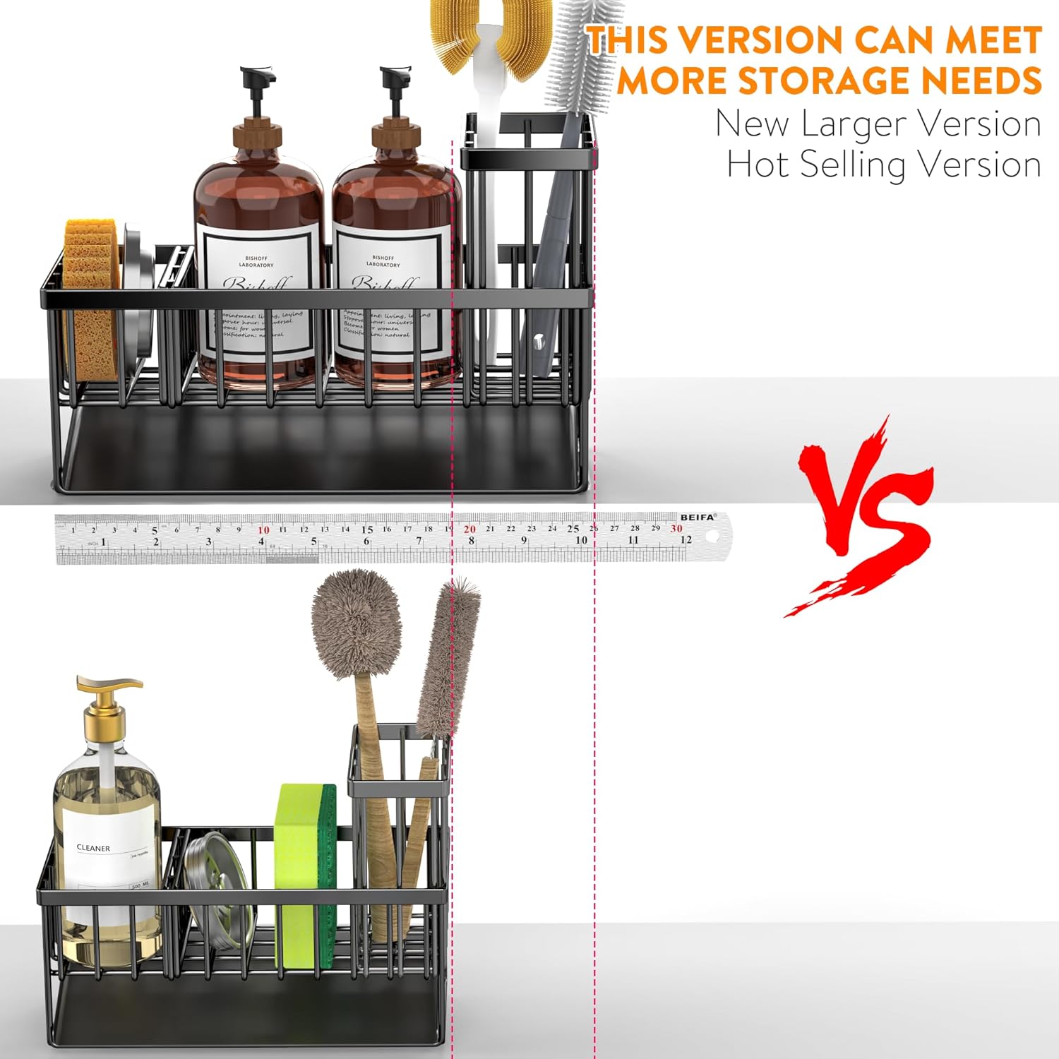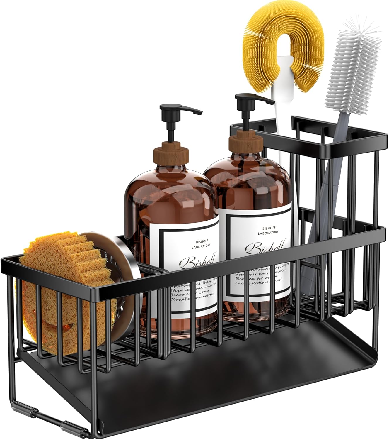 - ăEXTENDED AND LARGER CAPACITYăCisily sponge holder has upgraded size. The size is only 10.62 inches * 3.97 inches * 6.37 inches, which can accommodate detergent bottles, sponge balls and sink plugs. Cisily sink organizer is additionally upgraded with a brush holder, which can hold up to 4 large and small brushes, perfectly saving countertop space.