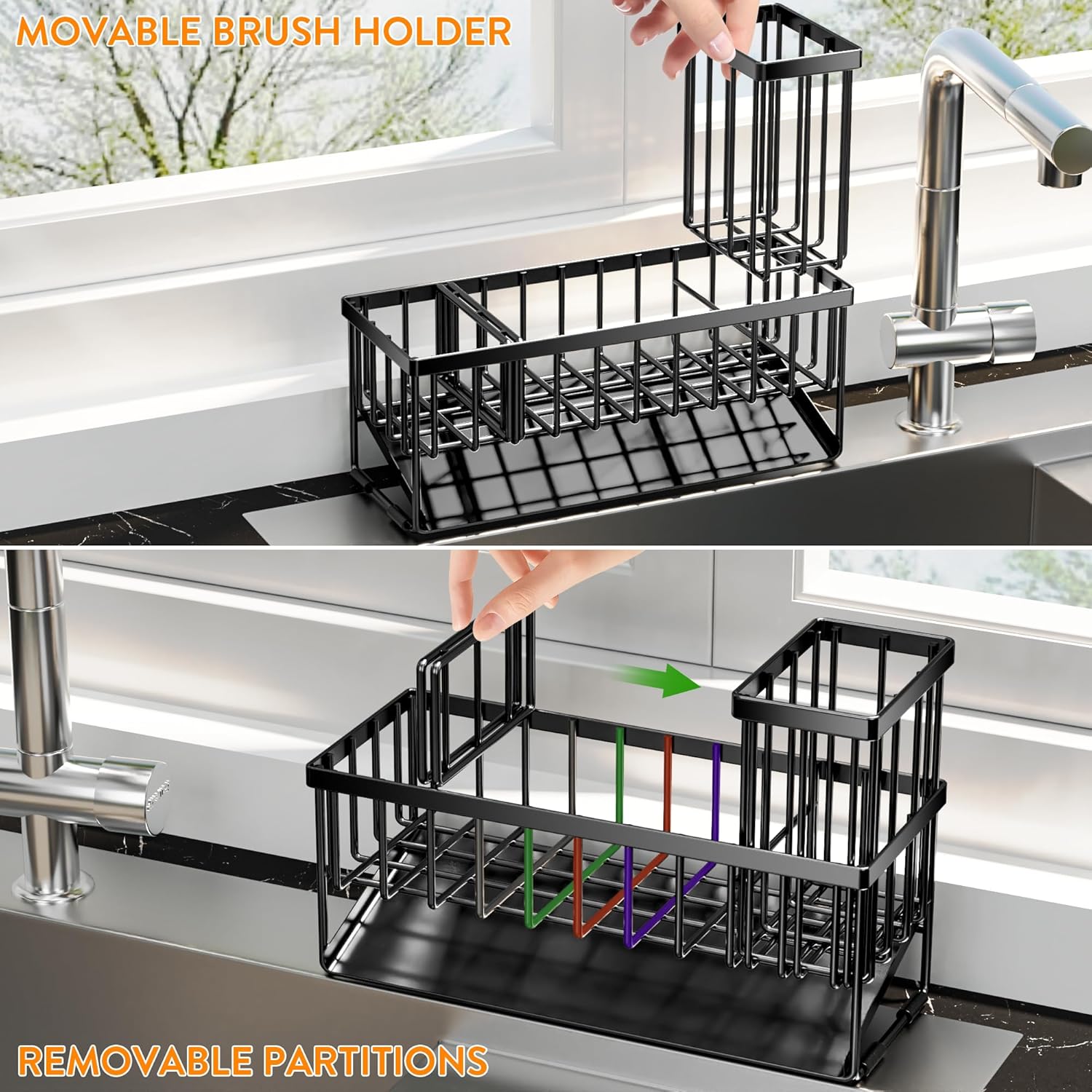 - ăREASONABLE DIVIDER DESIGNă The sponge holder for kitchen sink ergonomic divider design allows it to have 3 separate storage spaces, Different items are placed in different areas. Make the most of every inch of space and make your kitchen look cleaner.