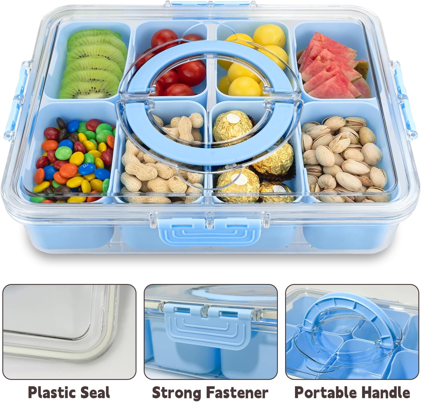 Divided Serving Tray with Lid and Handle,8 Compartments Snacks Box,Snack Fruit Veggie Tray,Portable Platter for Candy Fruits Nuts Snack Party Entertaining Picnic (2PCS Blue)