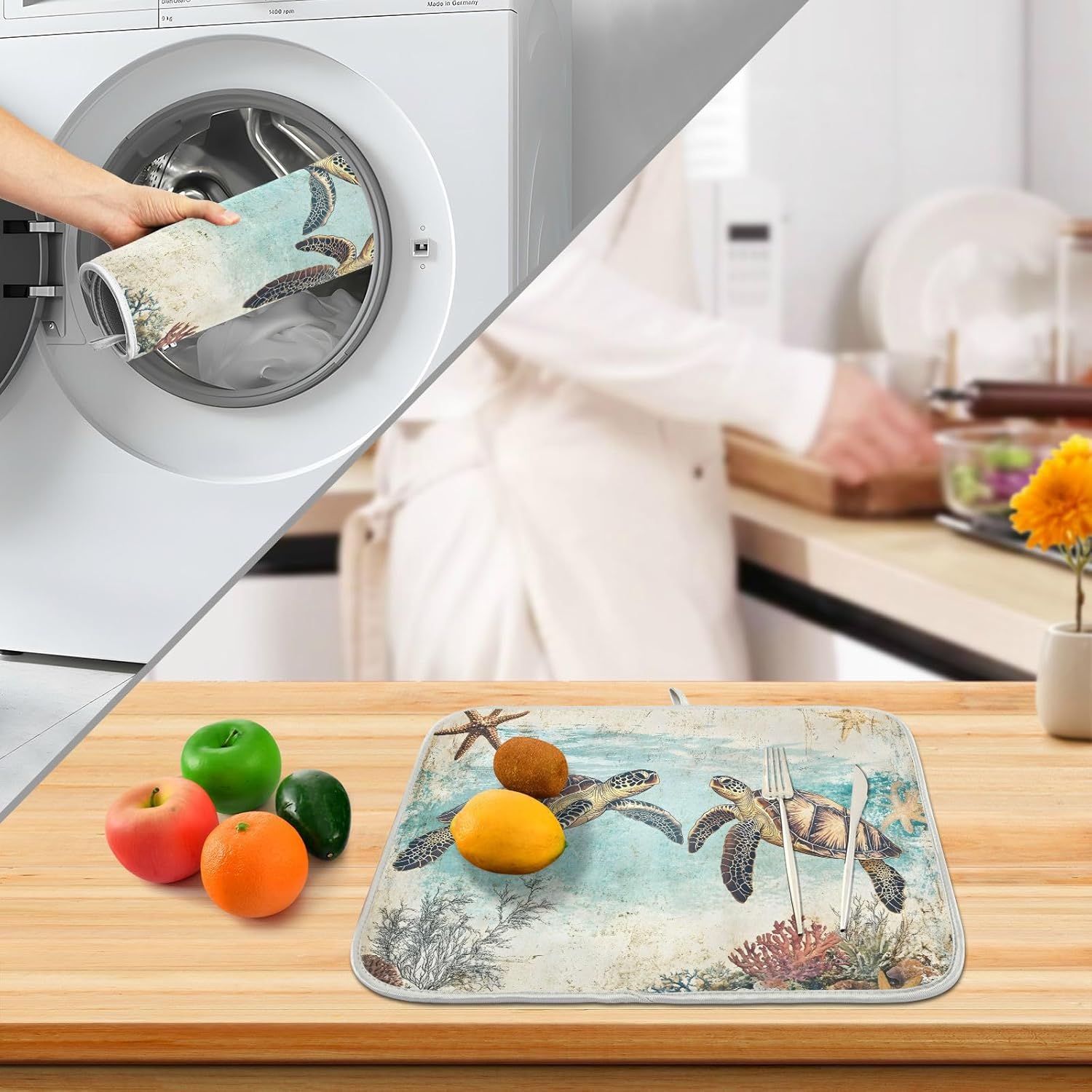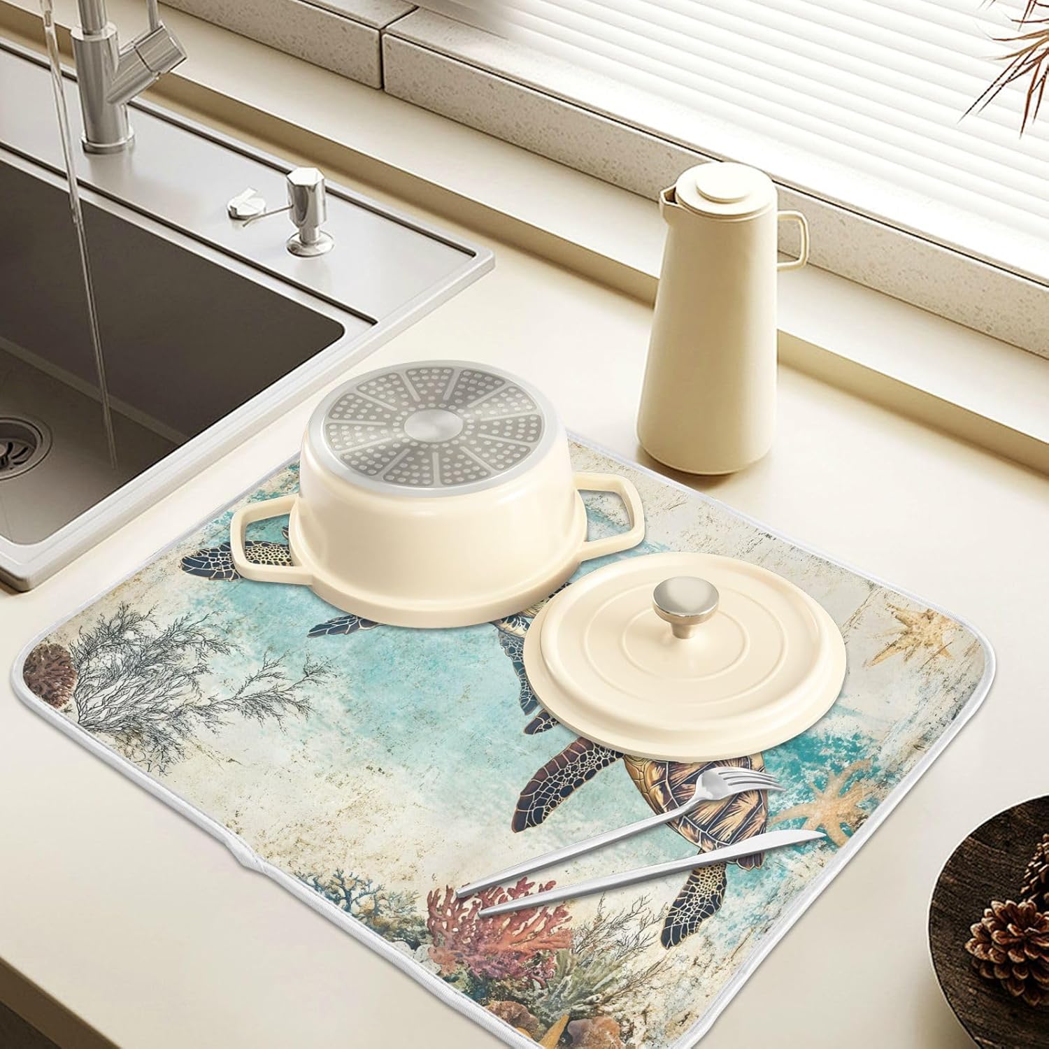 Vintage Ocean Sea Turtle04 Dish Drying Mat for Kitchen Counter Absorbent Microfiber Small Drying Pad Dish mats for Kitchen Countertops 16 x 18 Inch