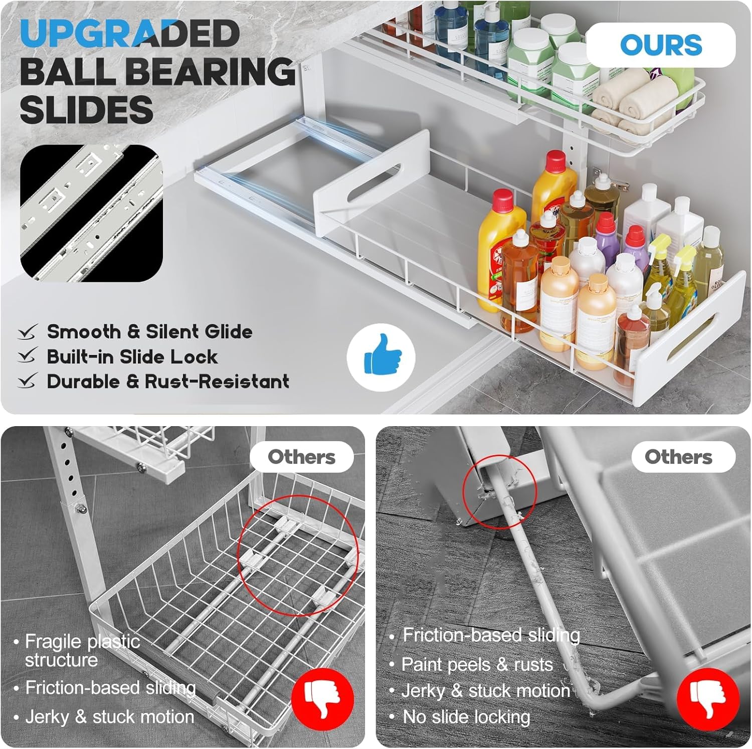 - Special Feature : 2-Tier Pull-Out Design, 5 Adjustable Heights, Classic Wire Frame, Silent and Anti-Tip Round Slide Rails 2-Tier Pull-Out Design, 5 Adjustable Heights, Classic Wire Frame, Silent and Anti-Tip Round Slide Rails