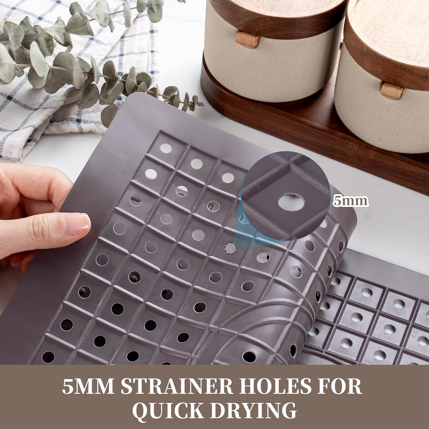 - 【Effective Water Drainage】 This sink mat features numerous 5mm drainage holes, ensuring excellent air circulation. These holes allow the mat to quickly drain surface water, effectively preventing puddles and keeping it dry. This design not only enhances convenience but also helps maintain the cleanliness of the mat.