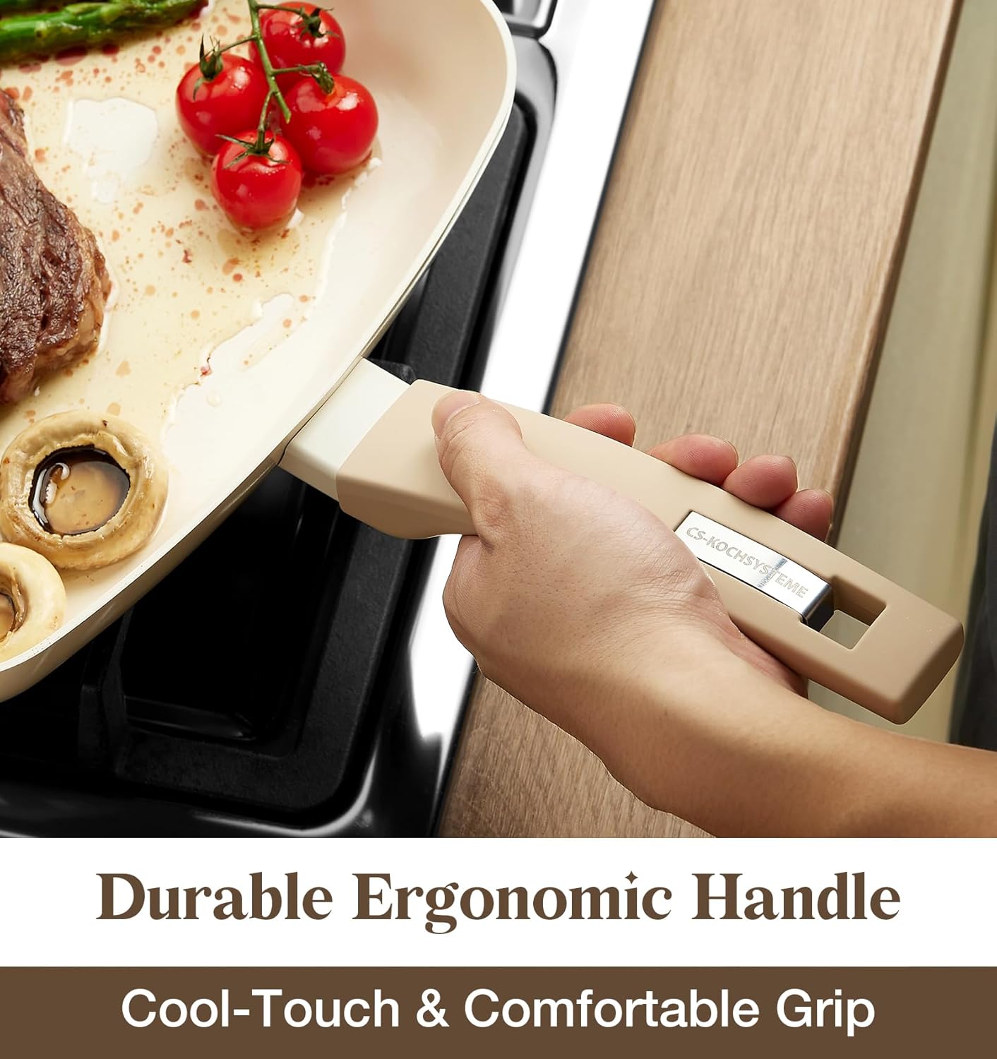 KOCH SYSTEME CS Nonstick Grill Pan for Indoor Cooking, 9.5 Inch Ceramic Square Frying Pan with Lid, Versatile Nonstick Griddle Pan for Stove Tops, Induction Compatible, Toxic-Free, Cream White
