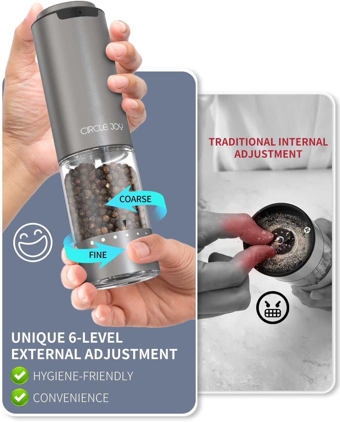 - 【HYGIENE MEETS CONVENIENCE】 - Say bye to messy, internal adjustments and hello to a cleaner, more hygienic way to tailor your grind. CIRCLE JOY salt and pepper grinder set boasts an innovative external coarseness adjustment mechanism, allowing you to easily dial in your desired texture without ever having to touch the peppercorns. This keeps your hands clean while in use, making it a great choice for health-conscious cooks