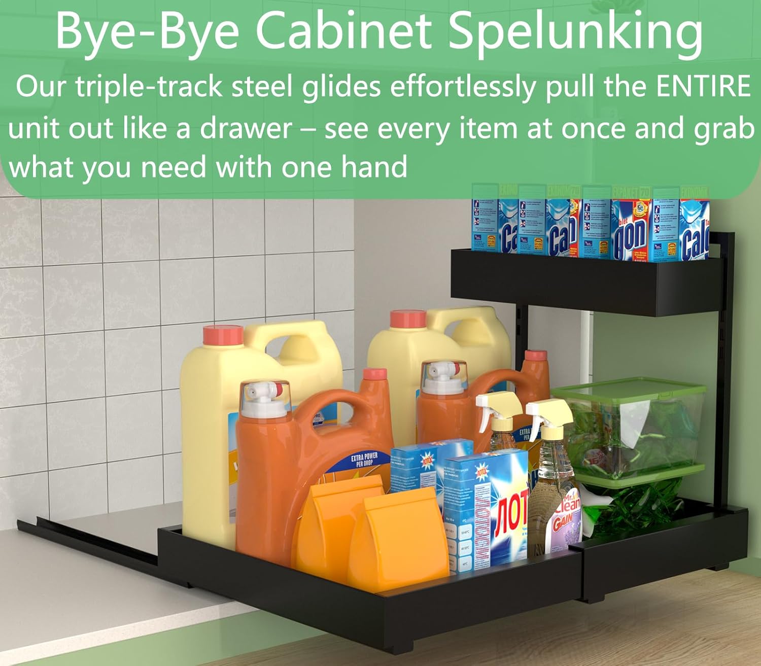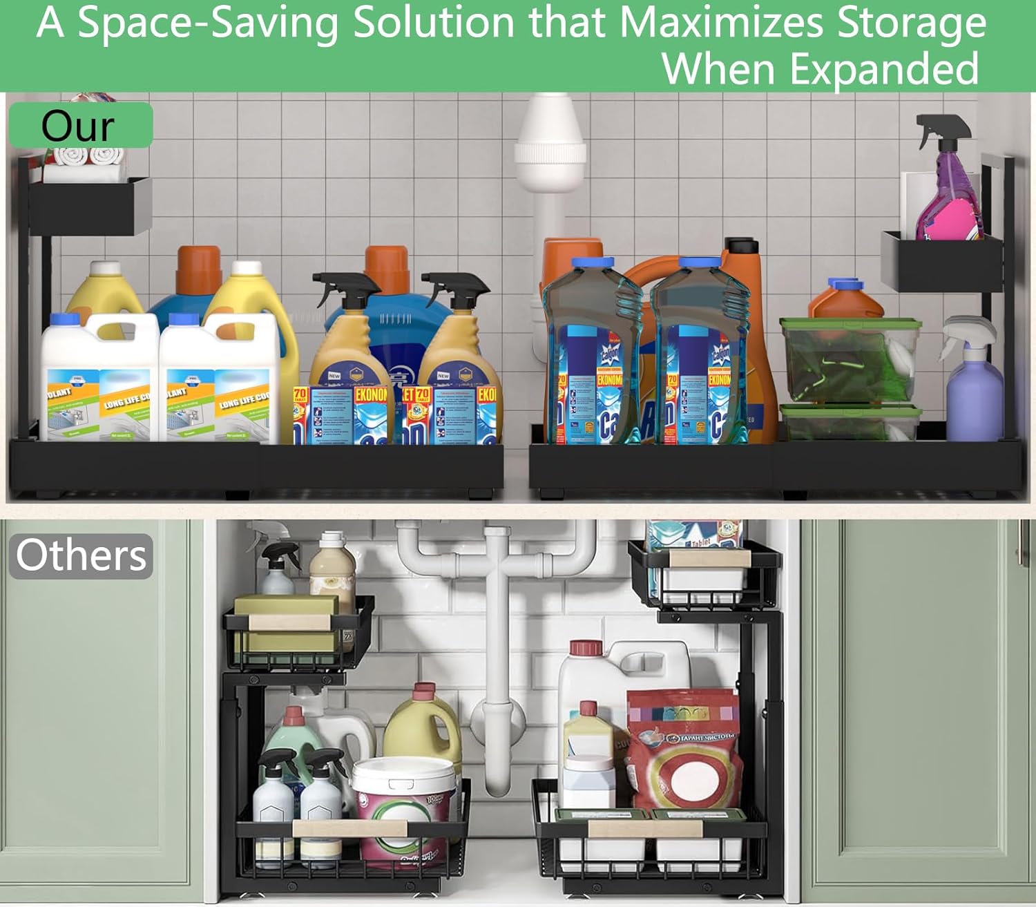 - Expandable Baskets - Ultimate Under-Sink Storage Solution Industry-exclusive expandable design instantly adds 66% storage space – perfect for under kitchen sink organizers and storage. Holds bulky detergent jugs & cleaning supplies with no space waste