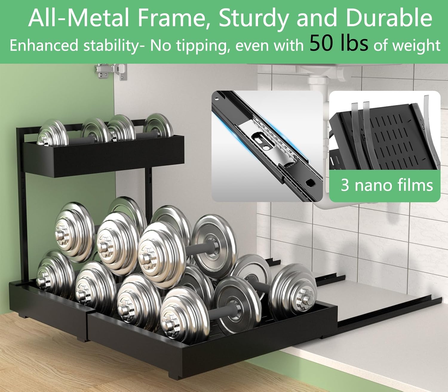 - Premium Powder-Coated Finish: 100% Rust-Proof Protection Triple-layer baked enamel coating shields stainless steel under cabinet organizer from humid damage. Outlasts competitors’ coated wire in wet bathroom under sink organizer environments
