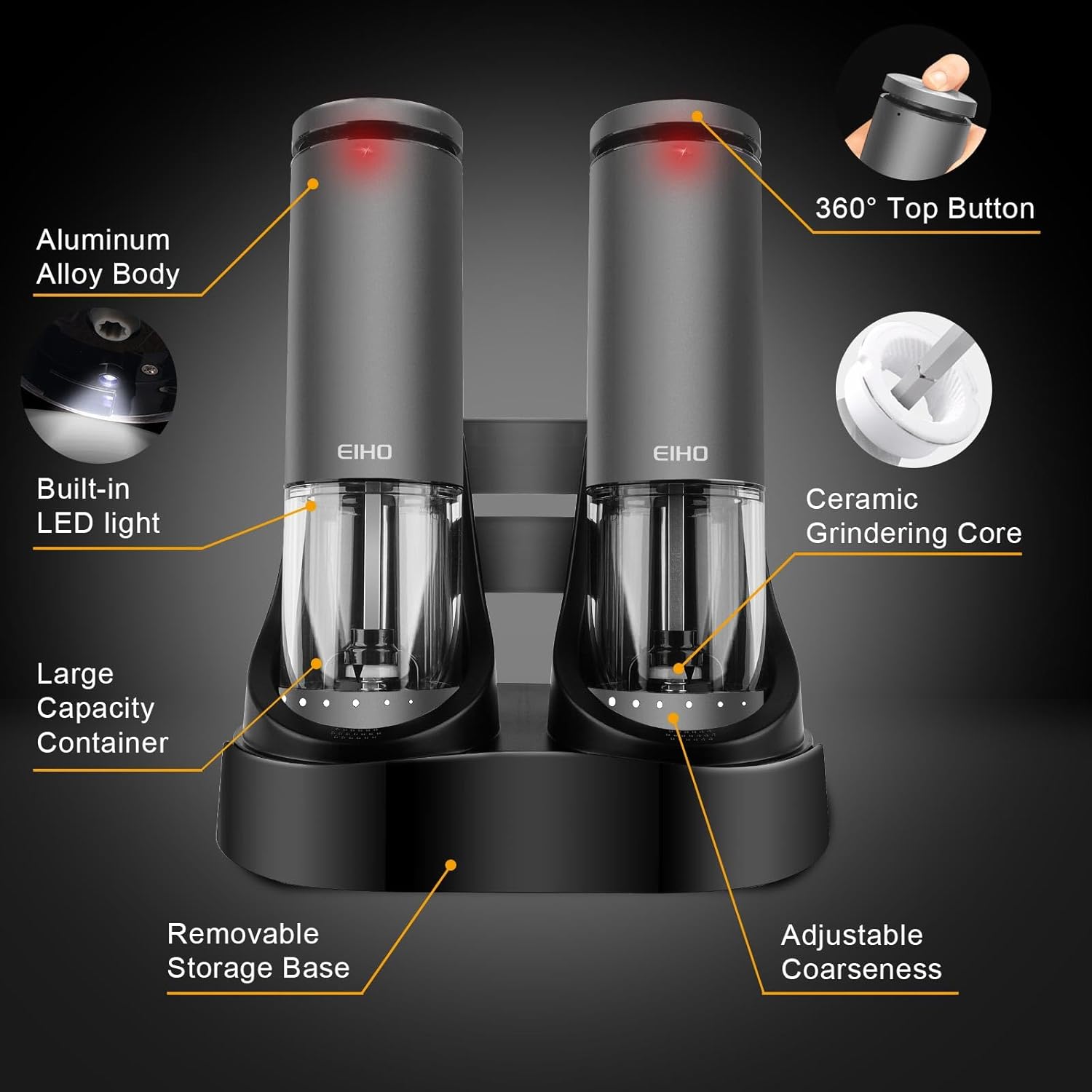 EIHO Electric Salt and Pepper Grinder Set USB Rechargeable, Upgraded External Adjustable Coarseness, Aluminum Alloy Automatic Salt and Pepper Shakers Mills with LED Light, House Warming Cooking Gifts