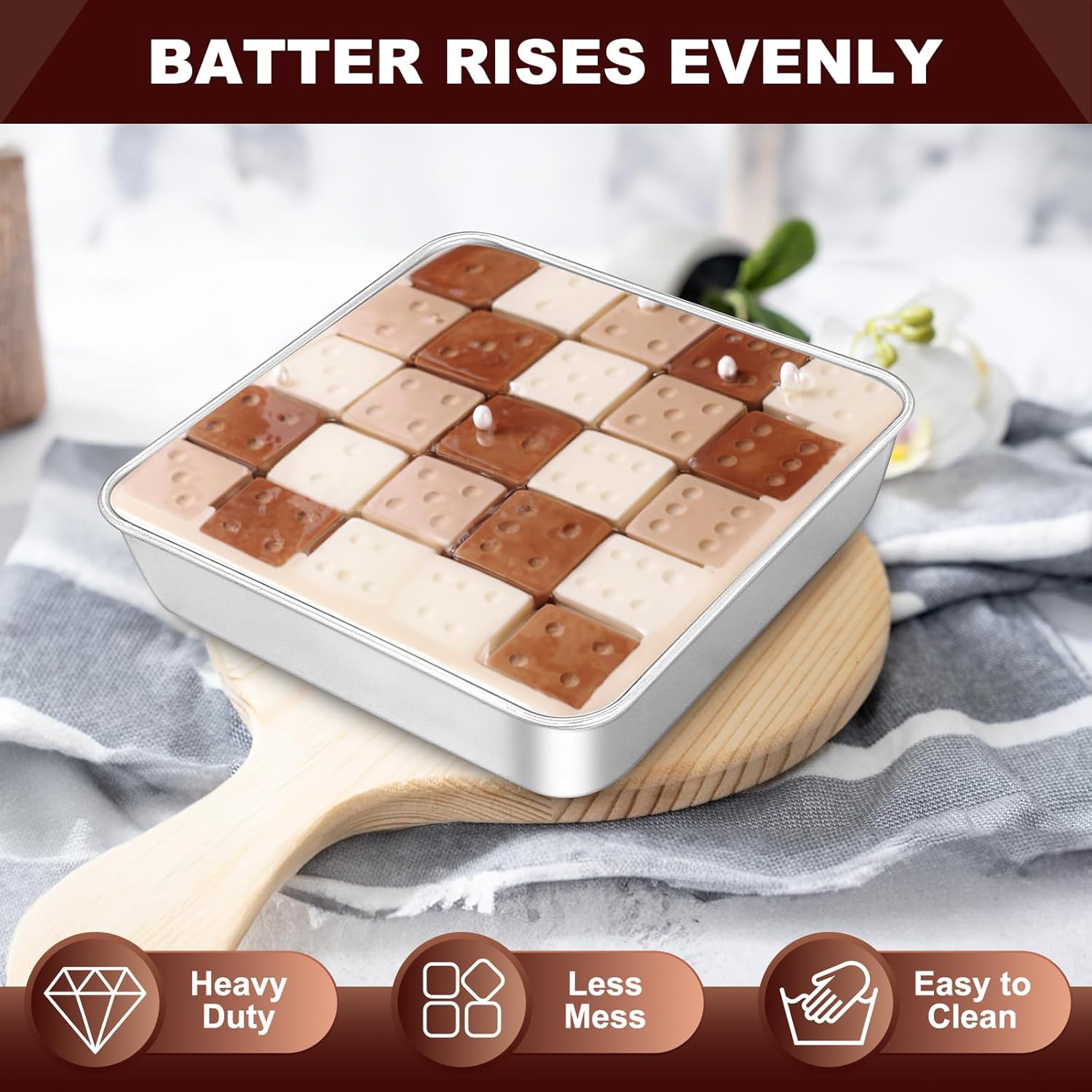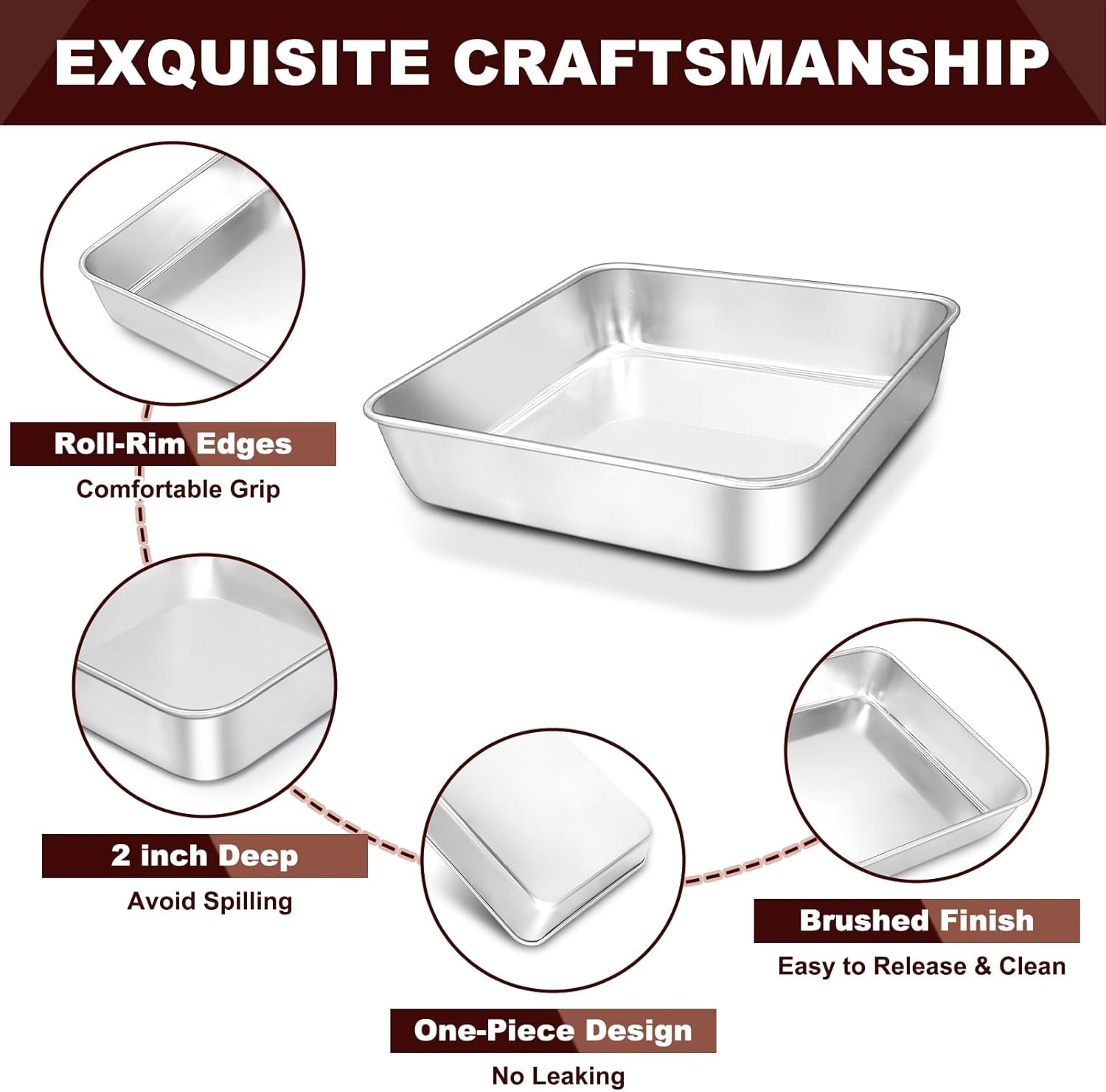 - PREMIUM STAINLESS STEEL CONSTRUCTION: Crafted from high-quality stainless steel without chemical coating, these square cake pans feature excellent durability and rust resistance. They can withstand high temperatures, ensuring long-lasting use for all your baking adventures, from roasting meats to baking casseroles and cookies.