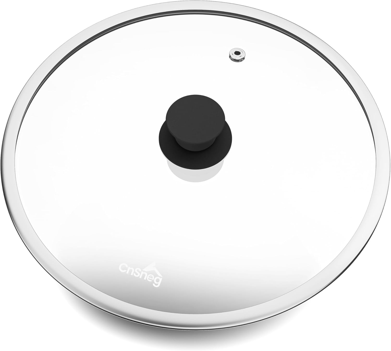 - 12 INCH PAN LIDS & MULTI PURPOSE: Crafted with HD tempered glass, leak proof SS304 steam vent, widened stainless steel rim and heat resistant silicone knob. The CnSneg glass lid fits most 12 inch diameter cookware of pans, pots, cast iron skillets, wok, saucepan, and frying pans.