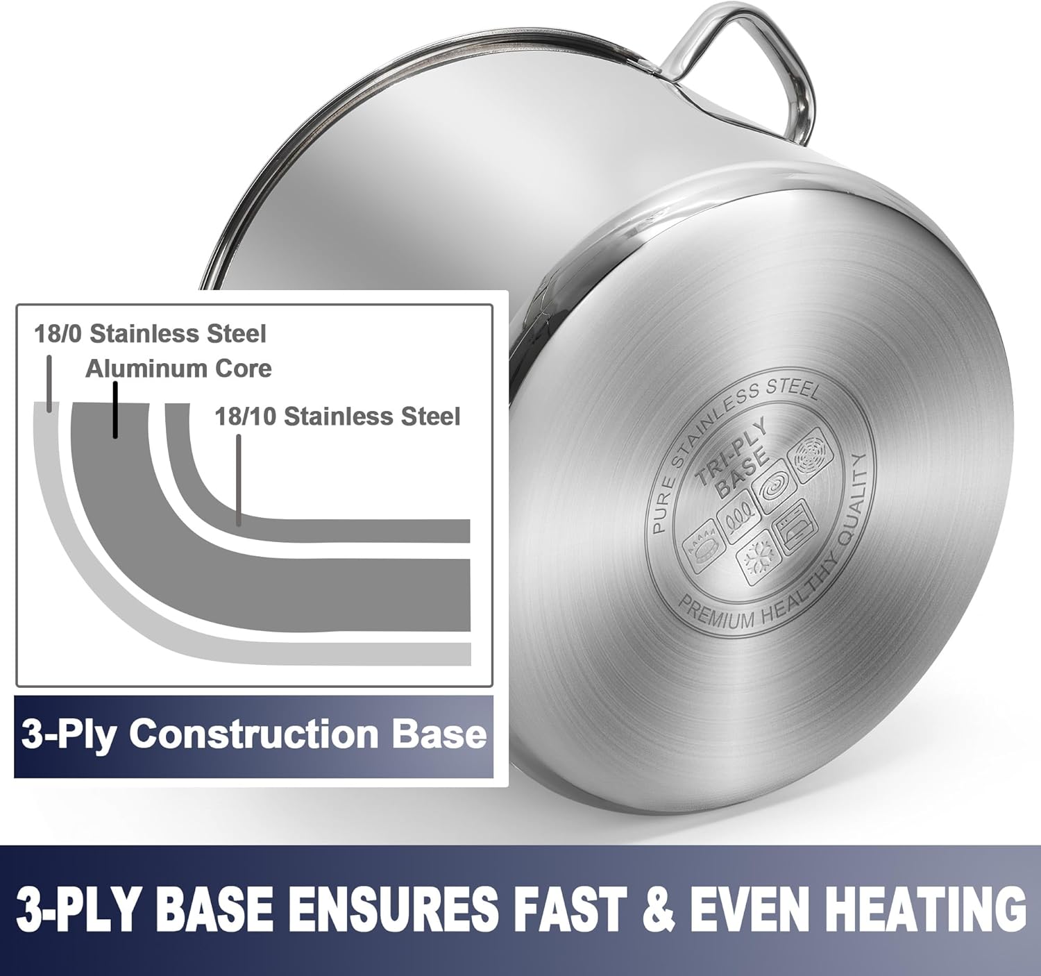 - Flat tri-ply base, thick base is composed of three layers, food grade inner layer 18/10 stainless steel without any harmful odor, healthy and safe for daily use, with an pure aluminum core gives good heat distribution and prevents hot spots, sturdy 18/0 stainless steel outer layer with thick bottom provides a great magnetic permeability function and makes it induction cooktop compatible