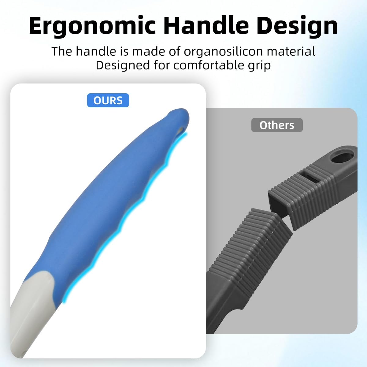 - [Innovative Inward Scraper Design] Unlike other kitchen brushes for dishes on the market, its scraper is not facing outward, there will be no situation the corners of the dishes cannot be cleaned due to the obstruction of the scraper. This dishwashing brush comes with an inward-facing scraper and the edge of the scraper is rounded, which can effectively remove the food residues adhering to tableware and cookware without damaging the surface