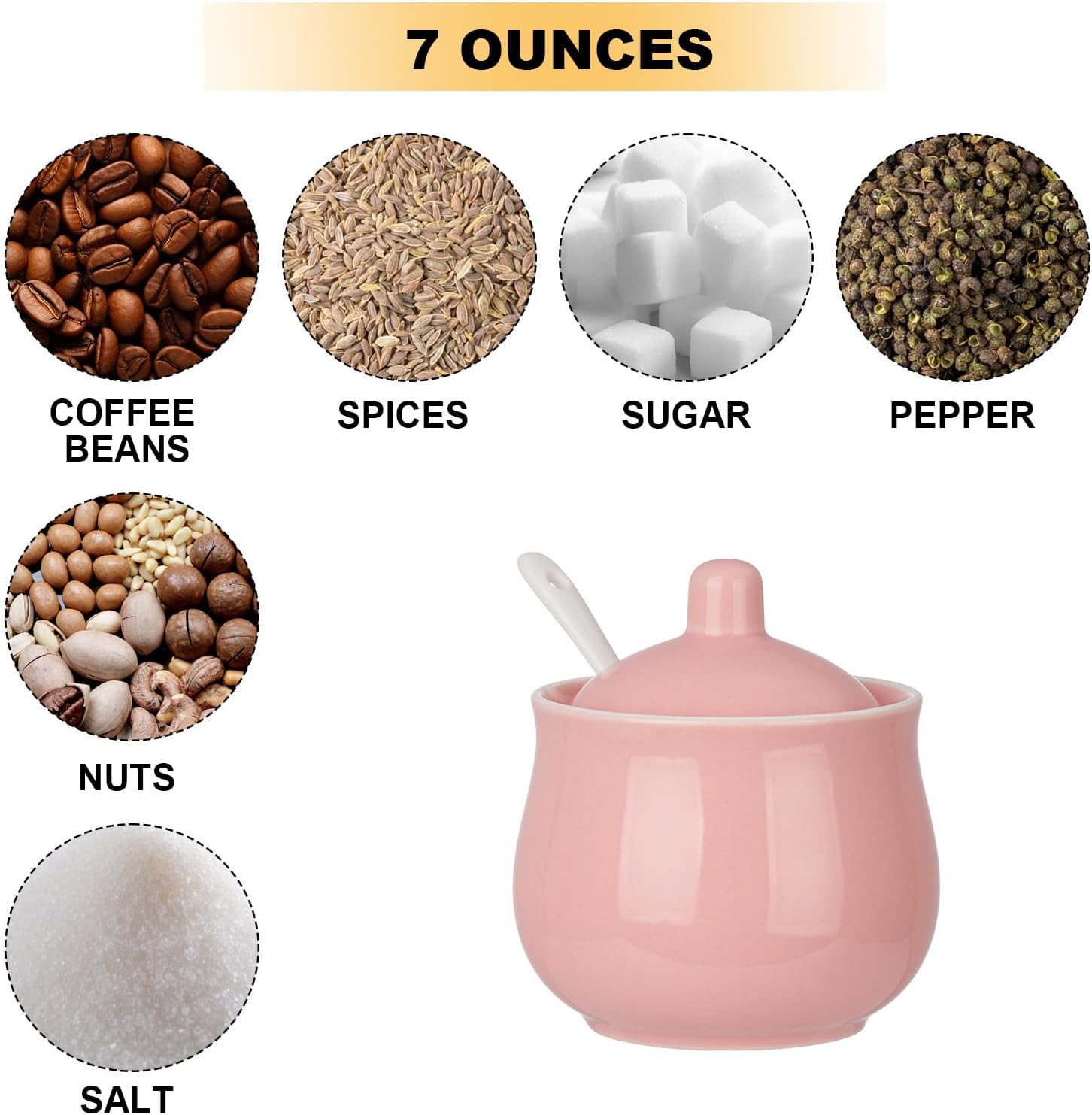 Ceramic Sugar Bowl with Lid and Spoon, Pink Porcelain Sugar Salt Pepper Storage Jar, 8 Ounces